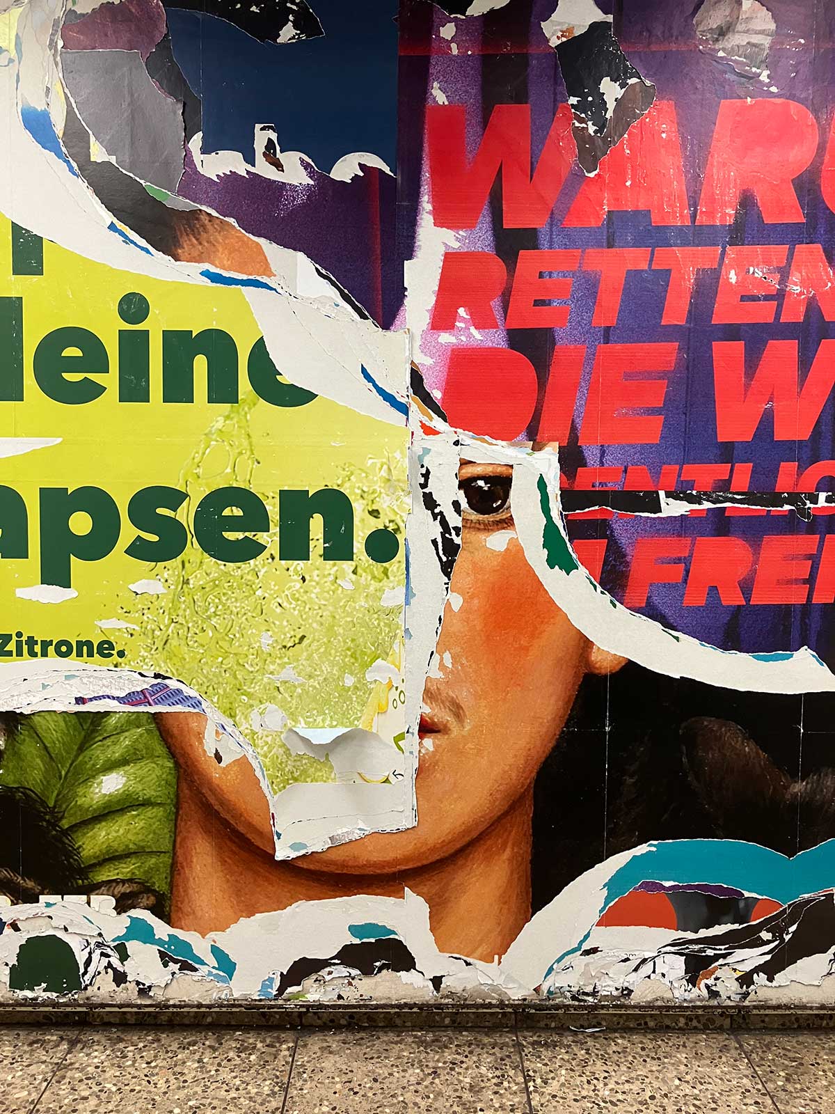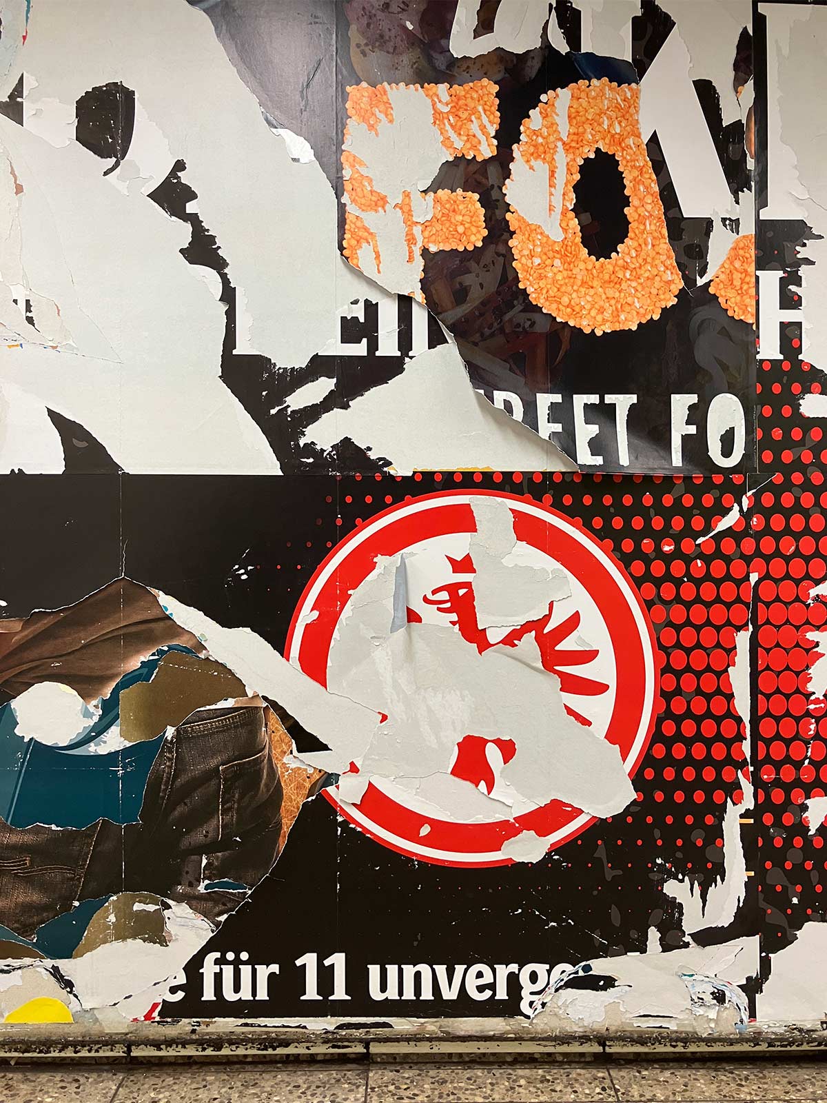 Die auf den Fotos zu sehenden Plakatwände gehören nicht zu dieser Art von Kunstwerken, obwohl einige Ergebnisse auch ohne künstlerisches Eingreifen interessant aussehen, insbesondere wenn Personen oder Objekte noch erkennbar sind, wie zum Beispiel die Frankfurter Skyline, die Künstlerin Frida Kahlo, der Komponist Ludwig van Beethoven oder auch das Wappen des Sportvereins Eintracht Frankfurt. Hier handelt es sich lediglich um großformatige Werbeflächen, die – so vermute ich – seitens der Betreiber*innen von einigen Papierschichten befreit und anschließend komplett weiß plakatiert werden, damit künftig erneut zahlreiche Plakate zu Veranstaltungen, Produkten und Dienstleistungen drangekleistert werden können. Da zwischen dem Plakatabriss und der Wiederherstellung der Werbefläche offenbar einige Tage vergehen, lassen sich hin und wieder solche décollagenartige Werke entdecken. In einigen Fällen lässt sich sogar noch nachvollziehen, welche Werbung vor einigen Monaten oder Jahren in Frankfurt präsent war. Beispiel: Das Bild, auf dem Frida Kahlo erkennbar ist, war ein Plakat, das Anfang 2020 für die Bewerbung der Ausstellung „Fantastische Frauen“ in der Schirn Kunsthalle zum Einsatz kam.