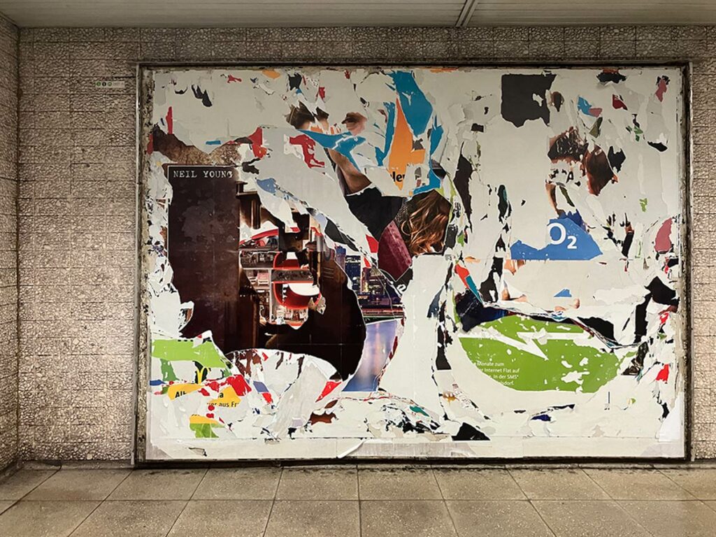 Während bei einer Collage ein Bild aus vielen Versatzstücken zusammengefügt wird, erfolgt bei einer Décollage das genaue Gegenteil: Teile eines Originalbildes werden entfernt. In weiteren Schritten werden Plakate noch übereinander geklebt und durch erneutes Abreissen bestimmter Stücke neu kombiniert. Der Ursprung dieses Themas liegt bei den Affichisten, die sich mit solchen Arbeiten von Ende der 1940er- bis in die 1960er-Jahre in den Straßen von Paris hervortaten. Bis zu 150 solcher Arbeiten waren vor bald 10 Jahren auch schon in der Schirn Kunsthalle in Frankfurt ausgestellt.