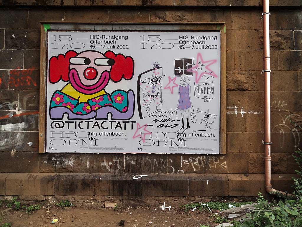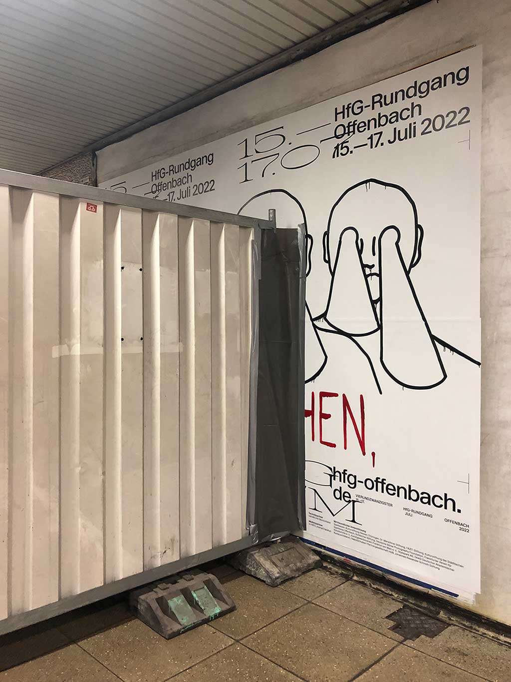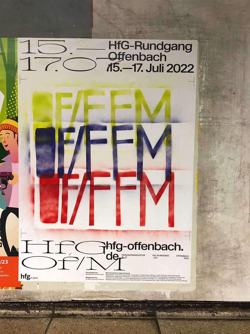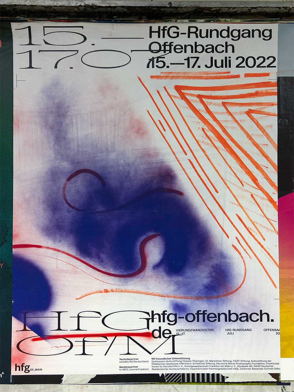 Beworben wird der diesjährige Rundgang an der HfG Offenbach mit Plakaten, mit denen die HfG den Gedanken demokratischer Kollaborationen feiern möchte. Grundlage ist ein von Grafikdesign-Studentin Katharina Landisch entwickeltes Design mit viel Weißraum, der direkt an Litfasssäule oder Plakatwand individuell gestaltet wurde, was jedes Plakat zum Unikat macht.