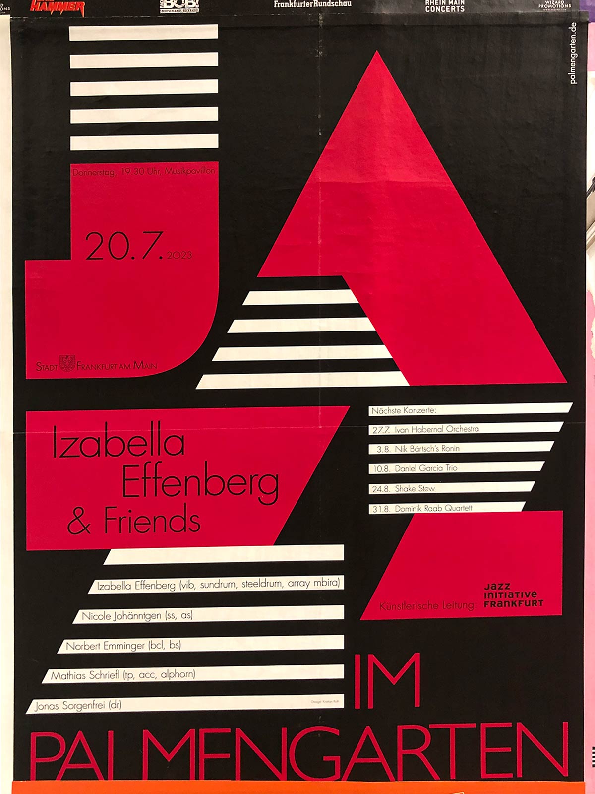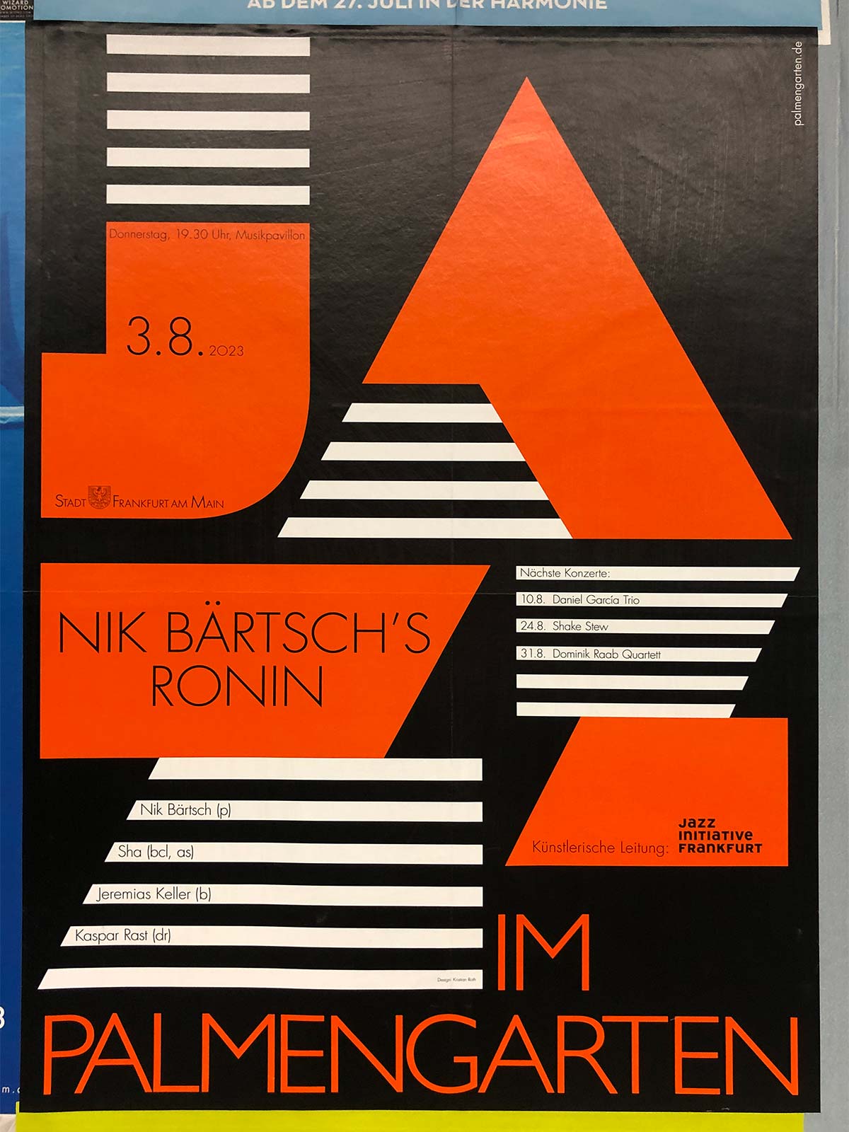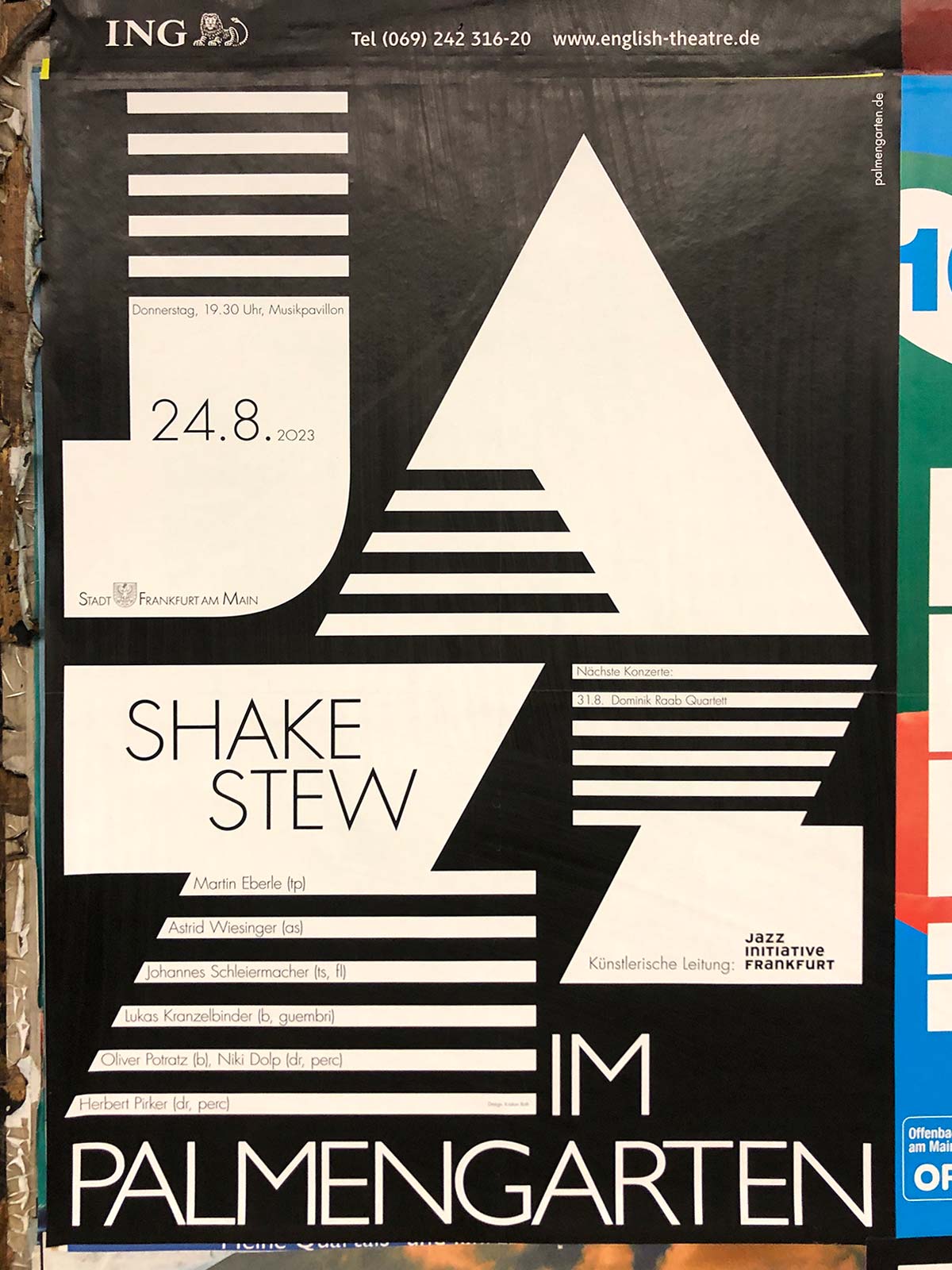 Seit 2003 liegt die künstlerische Betreuung der Veranstaltungsreihe „Jazz im Palmengarten“ in den Händen der Jazz-Initiative Frankfurt e.V. In diesem Jahr sind mir die zahlreichen Plakate in den U-Bahn-Stationen aufgefallen: Sie sind alle gleich gestaltet, unterscheiden sich nur in Farbgebung und Informationen zur jeweiligen Veranstaltung. Das ist einerseits schlicht, sorgt aber, ähnlich einer Logofamilie, für Wiedererkennung, und bewegt sich thematisch ganz in der Tradition von auffälligen und außergewöhnlichen Gestaltungen, die die Musikrichtung Jazz seit jeher begleiten, z. B. auf Schallplattencovern aus dem letzten Jahrhundert bis heute. Als Designer für diese Plakate wird Kristian Roth genannt, zu dem ich aber leider keine weiteren Informationen ausfindig machen konnte.