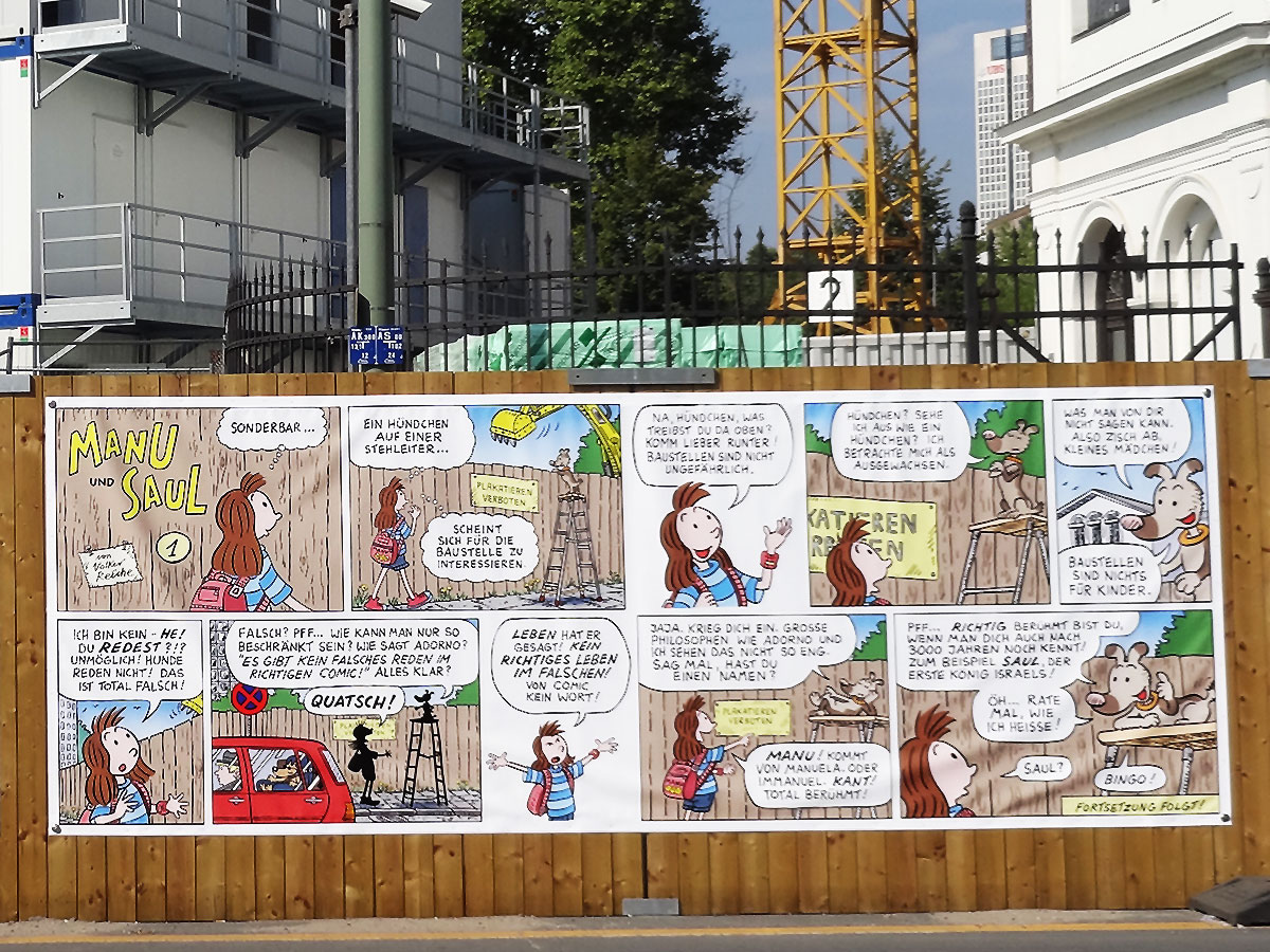 Seit dem 24. August dieses Jahres begleitet der Zeichner Volker Reiche mit seinem Bauzaun-Comic „Manu und Saul“ die Erweiterung des Jüdischen Museums in Frankfurt. Das Comic-Projekt wird alle zwei Wochen auf dem Bauzaun vor dem Rothschild-Palais um eine neue Folge ergänzt und bis zum Ende der Baumaßnahmen anhalten. Volker Reiche, der zuletzt im Podcast der Schirn Kunsthalle zu Gast war, thematisert in dem Comic anhand der Figuren Manu und Saul das Entstehen des neuen Jüdischen Museums.
