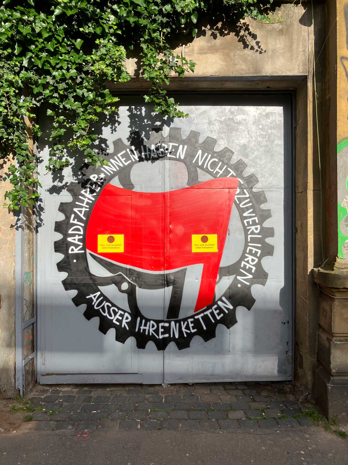 Im Mai dieses Jahres habe ich die Tür links vom Eingang zum ersten Mal ohne Bemalung, Plakate und Aufkleber gesehen – ähnlich wie einige Monate zuvor auch die Fassade in der Parallelstraße, wo nach vielen Jahren die umstrittene Parole „Niemand muss Bulle sein“ entfernt wurde. Interessanterweise schien das, nach all den lauten Diskussionen darüber, niemanden mehr zu interessieren. Standen wohl keine Wahlen an, waren wohl keine Klicks damit zu generieren. Im Gegensatz zu dieser Wand wurde die Tür jedoch schnell mit einem neuen Motiv bemalt, nämlich mit einem abgewandelten„Antifaschistische Aktion“-Logo, diesmal im Kontext des Radfahrens. Dazu ein abgewandeltes Zitat aus dem Manifest der Kommunistischen Partei: Aus „Die Proletarier haben nichts zu verlieren als ihre Ketten. Sie haben eine Welt zu gewinnen. Proletarier aller Länder, vereinigt Euch!“ wurde „Radfahrer*innen haben nichts verlieren, ausser ihren Ketten.“ Sind Radfahrer*innen also die neuen „Proletarier“?