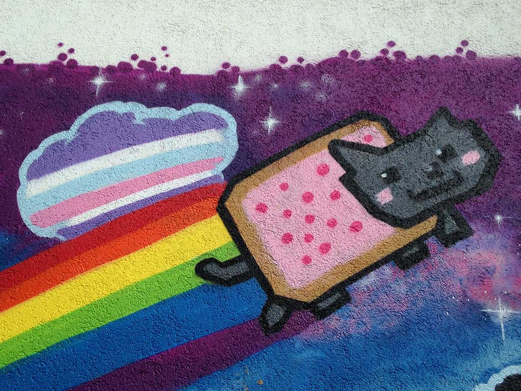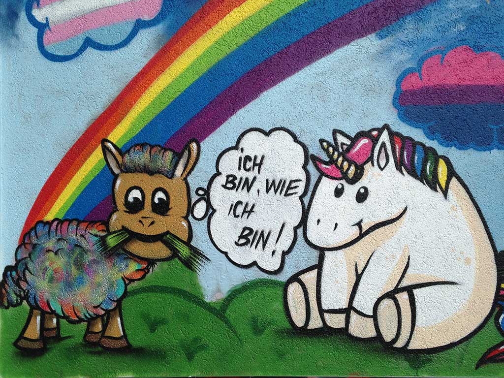 Beim queeren Jugendzentrum Kuss 41 in der Frankfurter Innenstadt ist vor einiger Zeit ein kleines Wandbild entstanden, auf der u.a. die bekannte Regenbogenkatze „Nyan Cat“ und das „Pummeleinhorn“ dargestellt sind.
