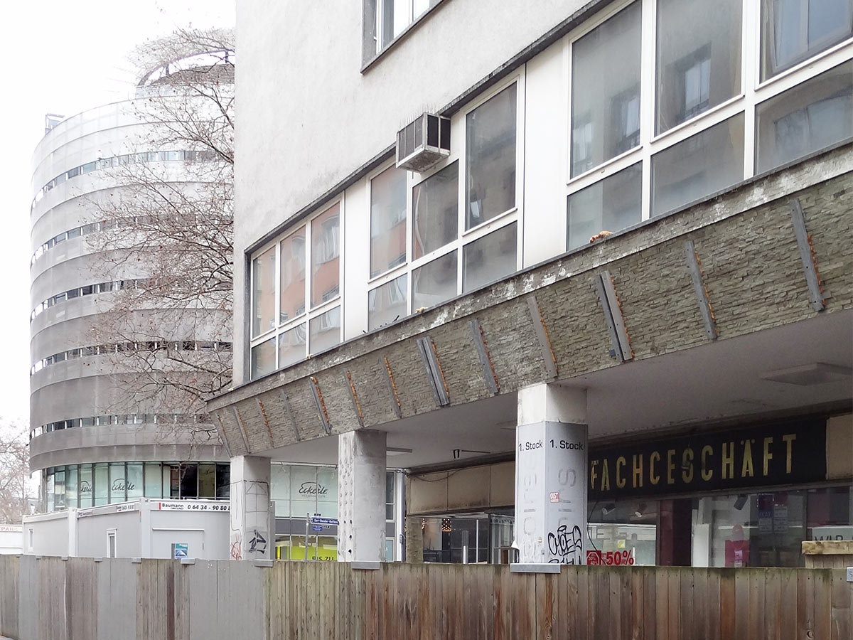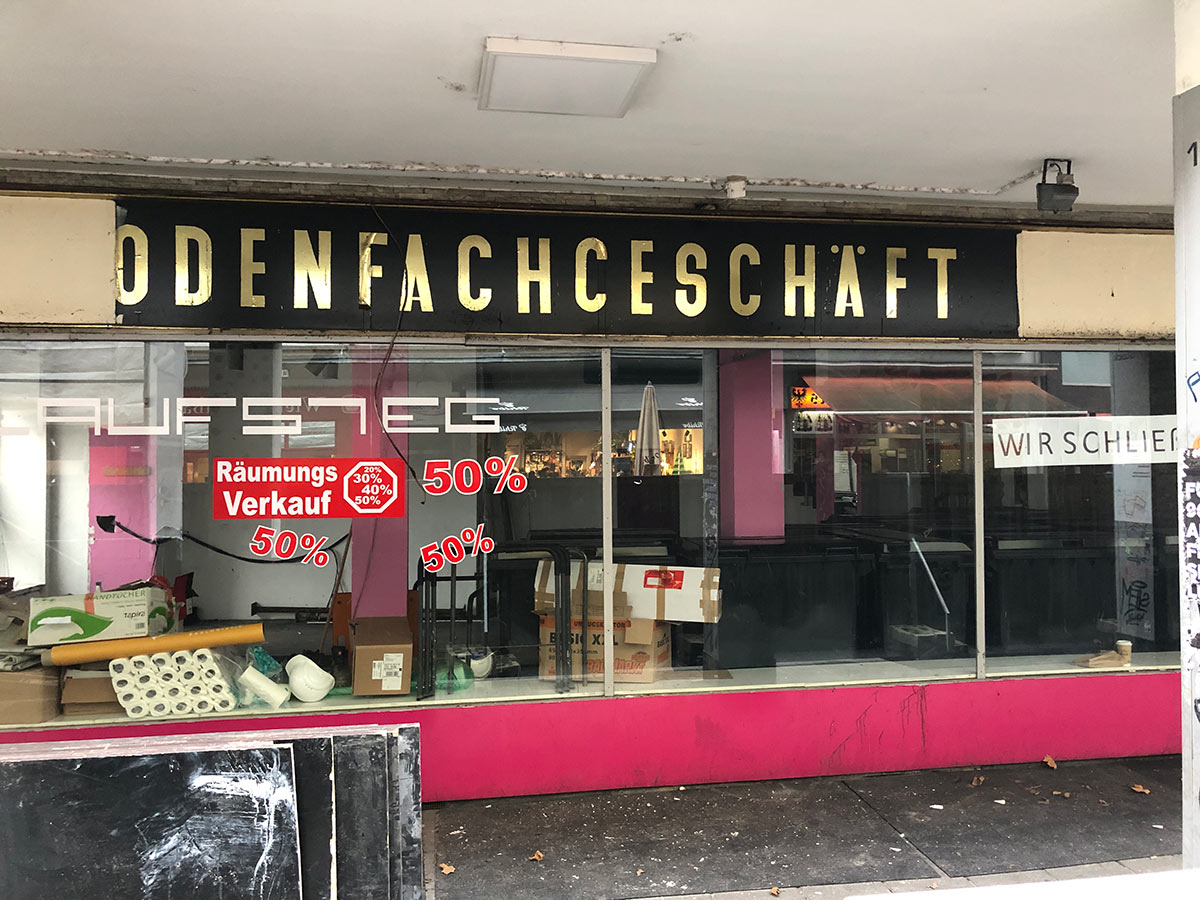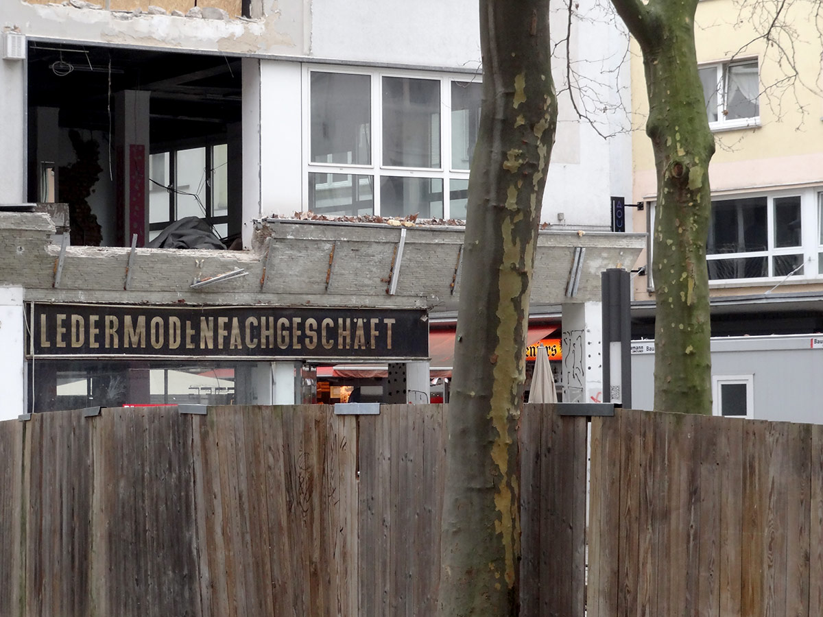 Das Haus an der Ecke Carl-Theodor-Reiffenstein-Platz und Hasengasse in der Frankfurter Innenstadt wird offenbar abgerissen. Bereits Mitte November hatte ich gesehen, dass dort eine Baustelle vorbereitet wird. Normalerweise würde ich mit Fotos von solchen Vorhaben so lange warten, bis das Gebäude signifikant „angeknabbert“ wurde, aber in diesem Fall fand ich das Schild im Erdgeschoss interessanter, denn wo bis vor Kurzem noch der auffällige Schriftzug des Geschäftes Laufsteg zu sehen war, ist nun ein offenbar deutlich älteres Schild mit der Bezeichnung Ledermodenfachgeschäft zum Vorschein gekommen.