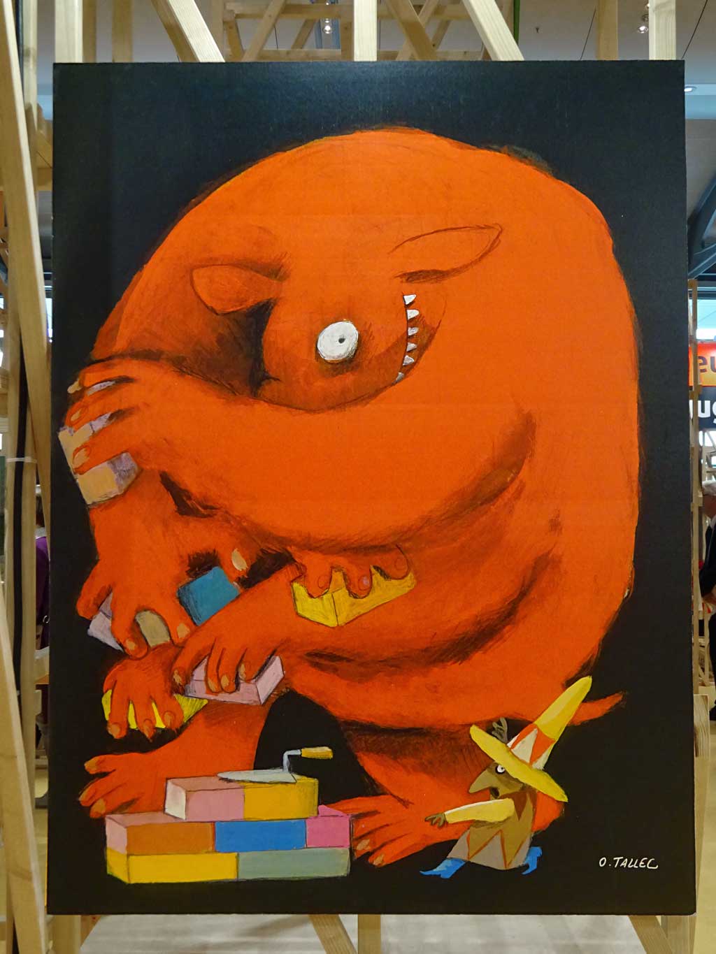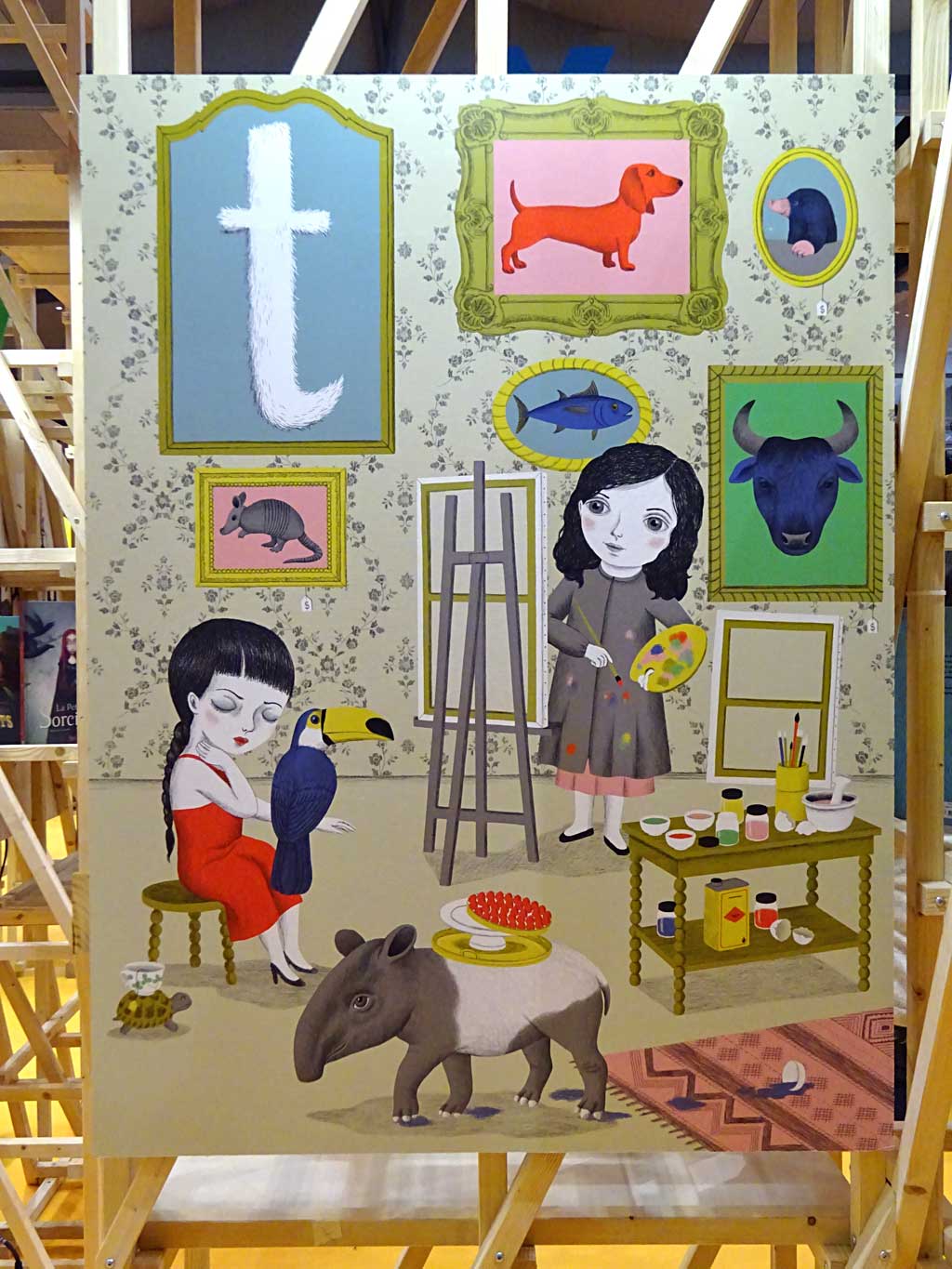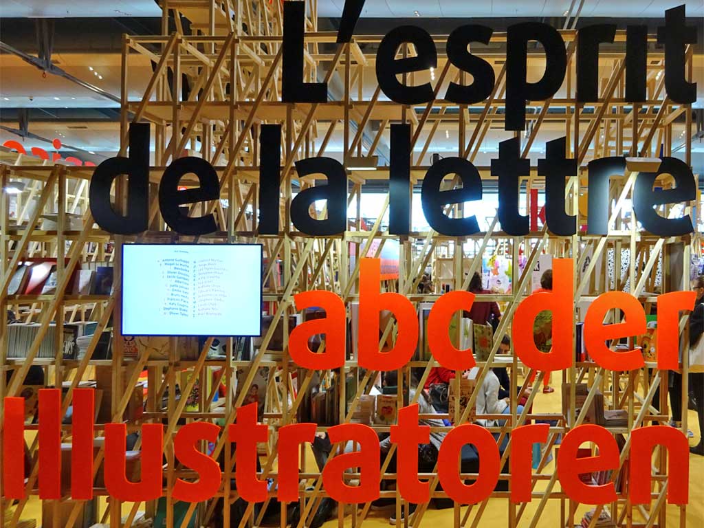 Unter den über 20 Themen, die im Pavillon „Francfort en français“ präsentiert werden, befindet sich nach dem Eingang rechts eine sehenswerte Ausstellung in Form eines ABCs, organisiert vom Salon du livre et da la presse jeunesse in Seine-Saint-Denis. Hierfür haben 26 französischsprachige Kinder- und JugendbuchIllustrator*innen für jeden Buchstaben des Alphabets zehn Wörter oder Redewendungen in Szene gesetzt.