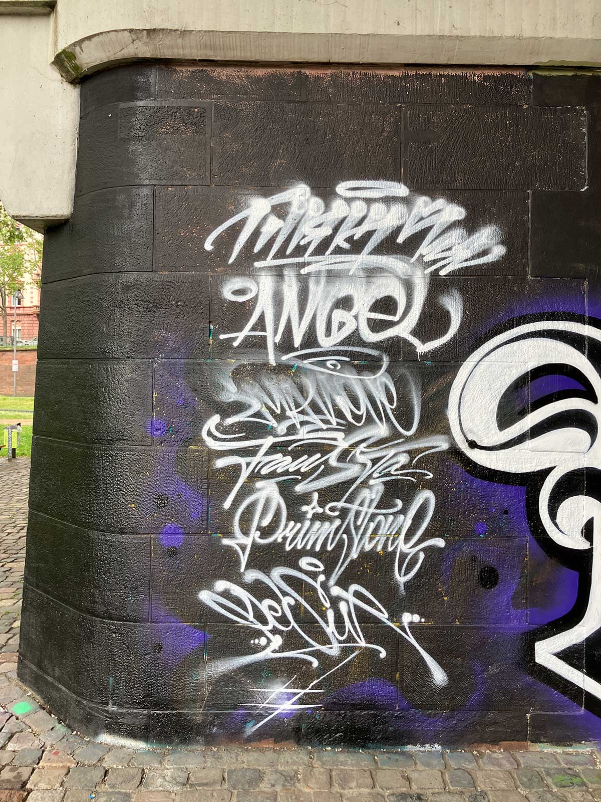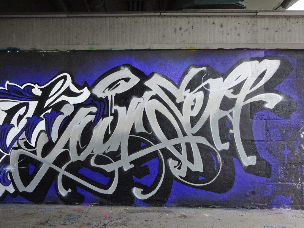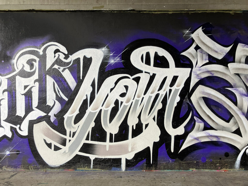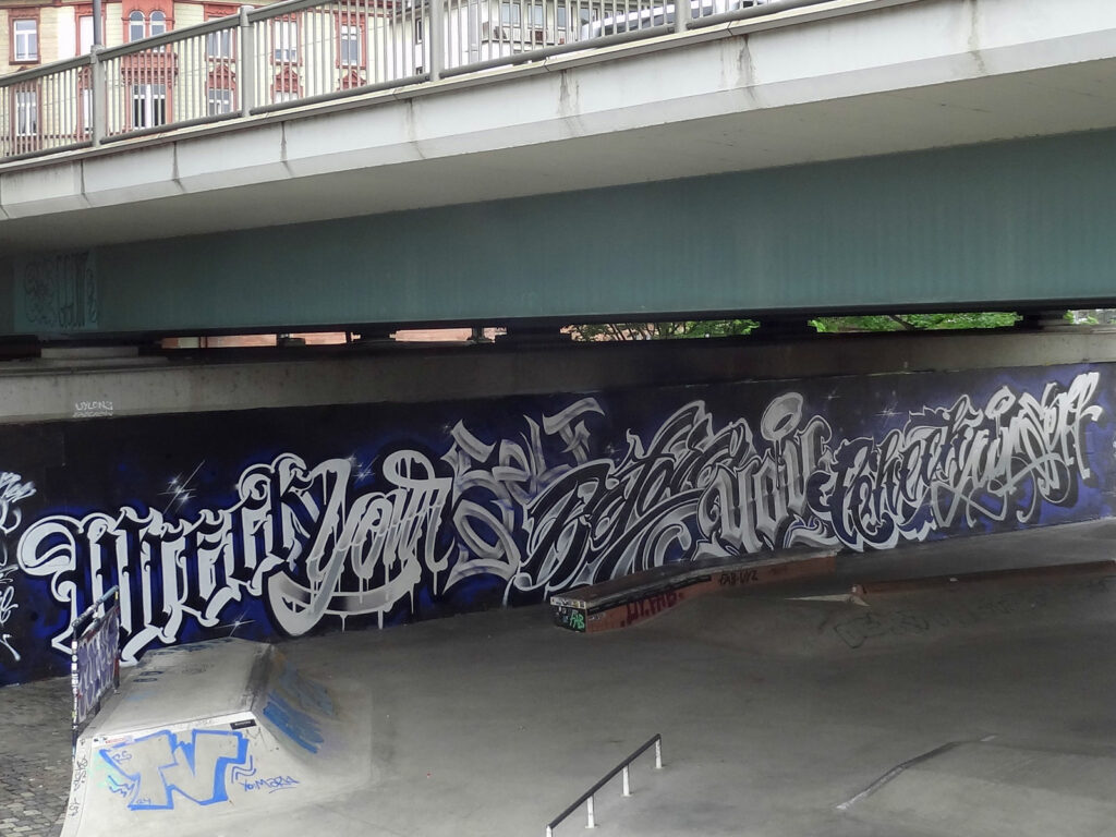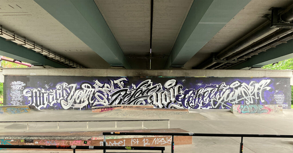 Treffen sich Tattoo- und Graffiiti-Künstler aus Deutschland, Italien, Mexiko, Russland und den USA zu einer Lettering Session an der Frankfurter Friedensbrücke: „Wreck yourself before you check yourself“ von Mr. Flaks @flaks32g (Wreck), Angel Lira @angelstat2 (Your), Mattone @mattone_12.13 (Self), Ivan Fansta @fanstaknado (Before), Maksim Primo @maksimprimo (You), Buster Duque @busterduque (Check) und Dustin @dustin_tattooism (Yourself).