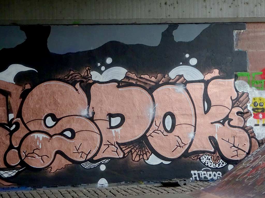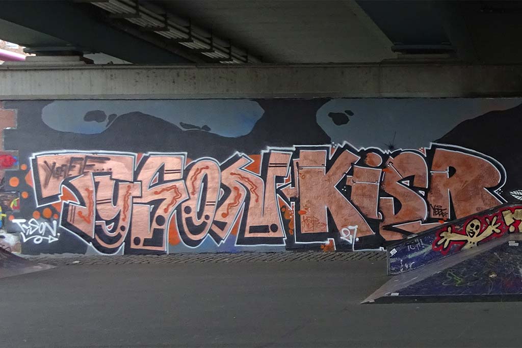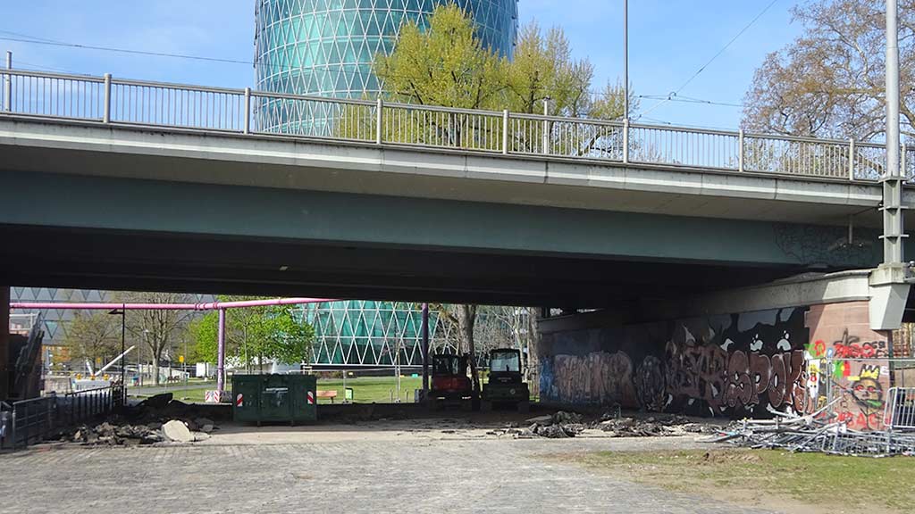 Mittlerweile hat sich das Szenario aber geändert, aber nicht weil das Motiv übermalt wurde, sondern weil die Umgestaltungs-/Sanierungsarbeiten der Skate- und BMX-Anlage an der Friedensbrücke (Azita Park) begonnen haben.