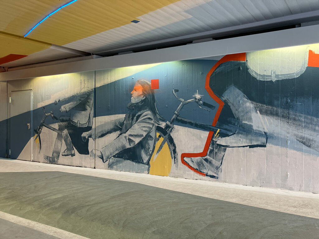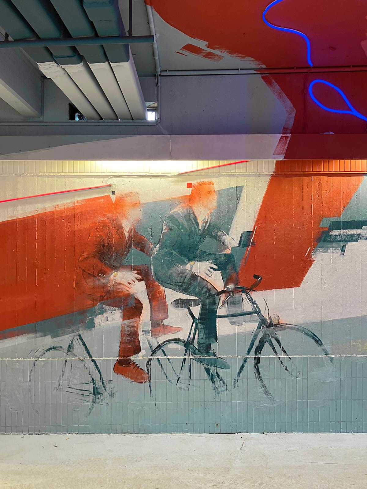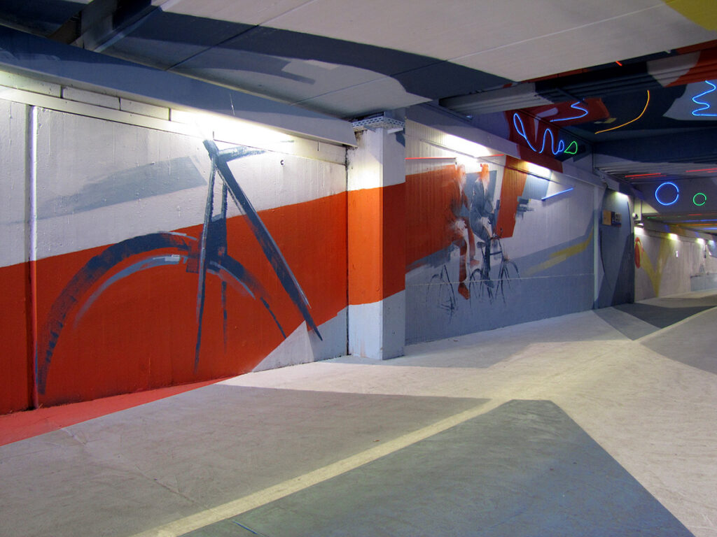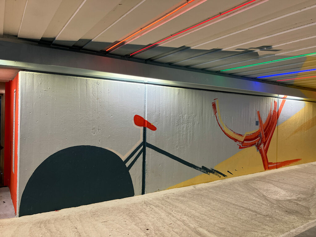 Guido Zimmermann hat mit dem für ihnen typischen Stil diesmal nicht nur Wände bemalt, sondern auch Teile des Bodens und der Decke in die Farbgestaltung einbezogen. Neben weißen, gelben, roten und blauen Flächen wurde besonders auf Motive mit Fahrrädern und Radfahrern gesetzt. Johannes-Nandu Kriesche hat weite Strecken der Deckenbemalung mit LED-Leuchten ergänzt, die abends bestimmt besser zur Geltung kommen, als auf den hier zu sehenden Fotos. Mir gefällt das Zusammenspiel von Malerei und Licht in diesem Projekt extrem gut. In dieser Form, als Kunstinstallation im öffentlichen Raum, war mir das noch nicht bekannt und hoffe auf vergleichbare Projekte in Frankfurt.