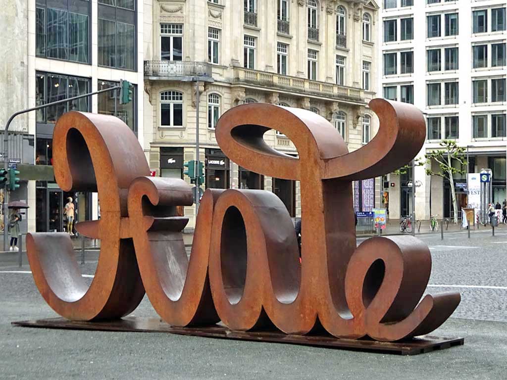 Normalerweise steht die Love/Hate-Skulptur vor dem Senckenberg Naturmuseum im Frankfurter Westend, doch anlässlich der anstehenden Europawahl ist die Skulptur der Konzept- und Performance-Künstlerin Mia Florentine Weiss in die Innenstadt umgezogen.