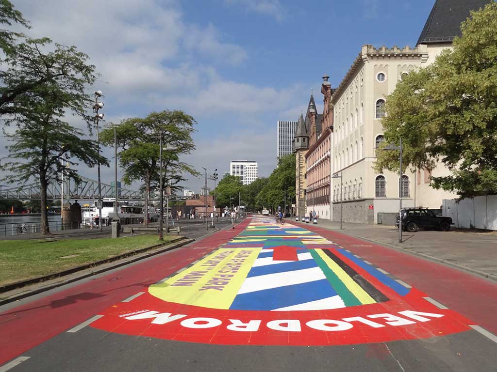 Autohasser*innen, oder wie sich sich selbst verniedlichend nennen „Frankfurter Fahrrad-Bubble“, sind größtenteils Idiot*innen, die Änderungen von anderen fordern, während sie selbst permanent rote Ampeln missachten, Radwege in die Falsche Richtung nutzen oder schlichtweg auf Gehwegen fahren (und entlangbrettern) – nur falls sich jemand fragt, wie dieses „Mit dem Fahrrad wärst du schon längst da“ wirklich funktioniert. Unter Achtung der StVO jedenfalls nicht, da ändert auch nichts daran, dass ungefragt auch immer Fußgänger*innen für die Ziele von Radfahrer*innen eingemeindet werden, wo eigentlich jede*r weiß, dass Fußgänger*innen eher mit Radfahrer*innen ihre Probleme haben, von den in Herbst und Winter völlig verwaisten Radwegen mal ganz zu schwiegen. Von daher wird es also nicht lange dauern, bis Fotos dieses vielleicht 300 Meter bemalten Abschnitts am Mainkai auch in Beiträgen auftauchen wird, in denen irgendetwas davon krakeelt wird, „wie toll man Flächen nutzen kann, wenn keine Autos da sind!!!“ – einfach so, weil so „schön“ bunt oder weil es drei, vier organisierte Events auf diesem Teilabschnitt geben wird und mit Fotos davon so getan werden wird, als sei da immer total viel los gewesen, als hätten die Bürger*innen den Main wieder erobert.