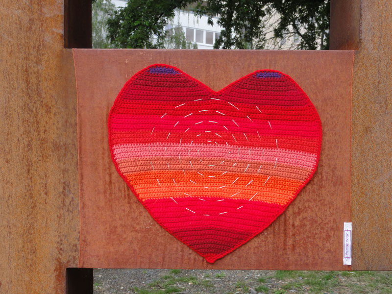 Zuletzt entdeckte ich etwas am vergangenen Wochenende, und zwar entlang der Wallanlagen an der Friedberger Anlage/ Ecke Allerheiligenstraße, Dort steht seit einiger Zeit die große LIEBE-Skulptur von Cornelia Heier, die ich hier im Blog auch schon mal thematisiert hatte, als sie noch am Ernst-Achilles-Platz im Frankfurter Ostend stand. Mata Haarig, die u.a. auch der Elch-Skulptur vor dem Caricatura Museum einst dieses wunderschöne bunte Geweih verpasste, hat an dieser Skulptur ein gestricktes Herz angebracht.