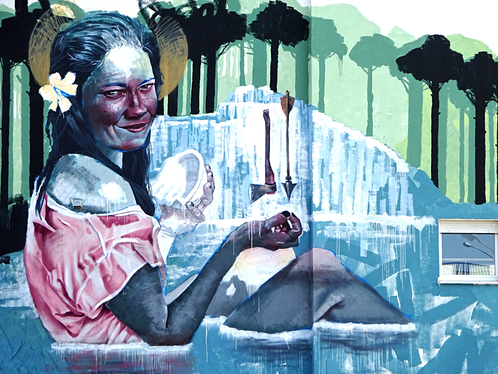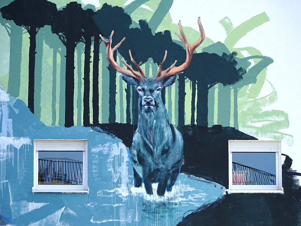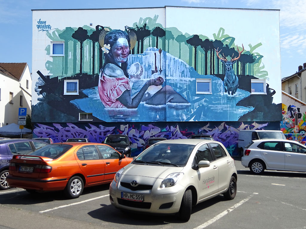 „To create this work I have been inspired by the city itself. That is why I have personified it as a woman and have added classic elements of the city: the thermal waters (famous since Roman times), the flower of Lis in the hair (it appears in the heraldic shield of the city), the shell In the hand (shield of the district where the wall is located, Mainz-Kastel), the vintage clothes that evokes an aristrocratic city, and vegetation, represented by the leafy forests that can be seen from the plane when you arrive.“ (Dan Ferrer)