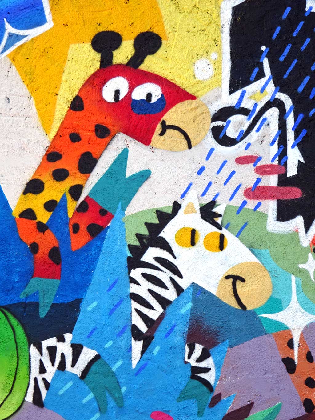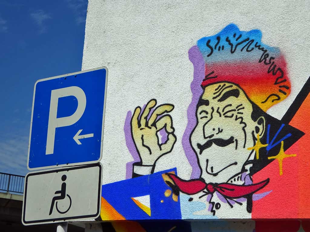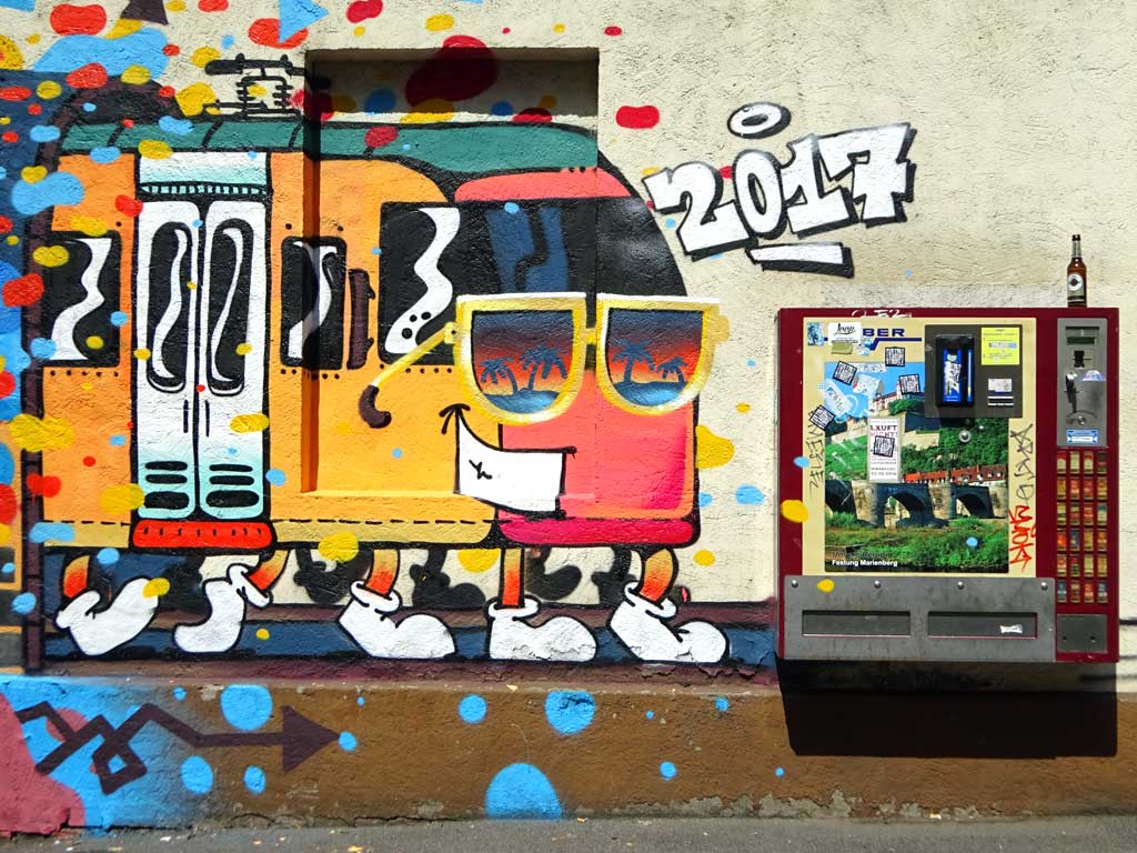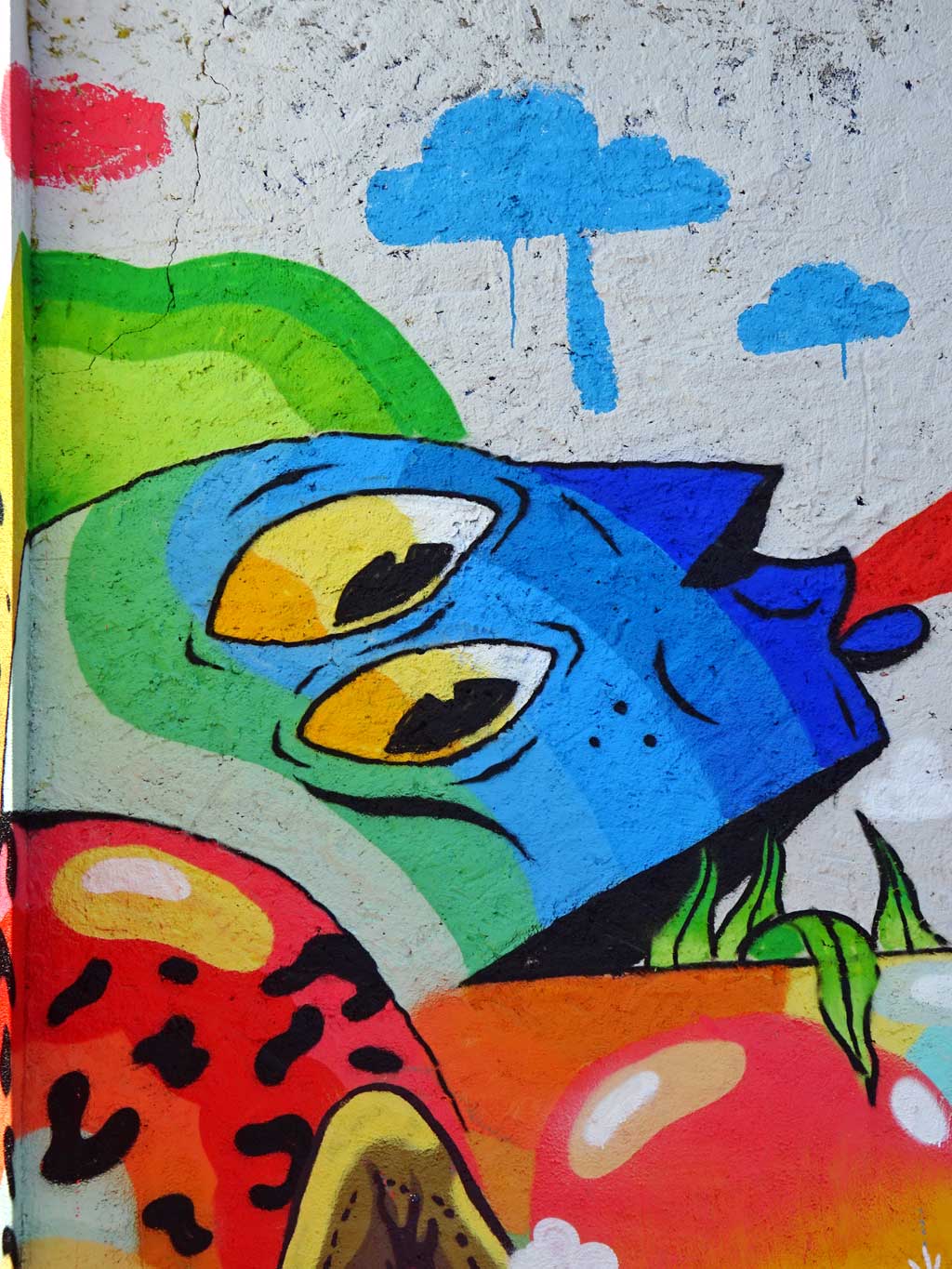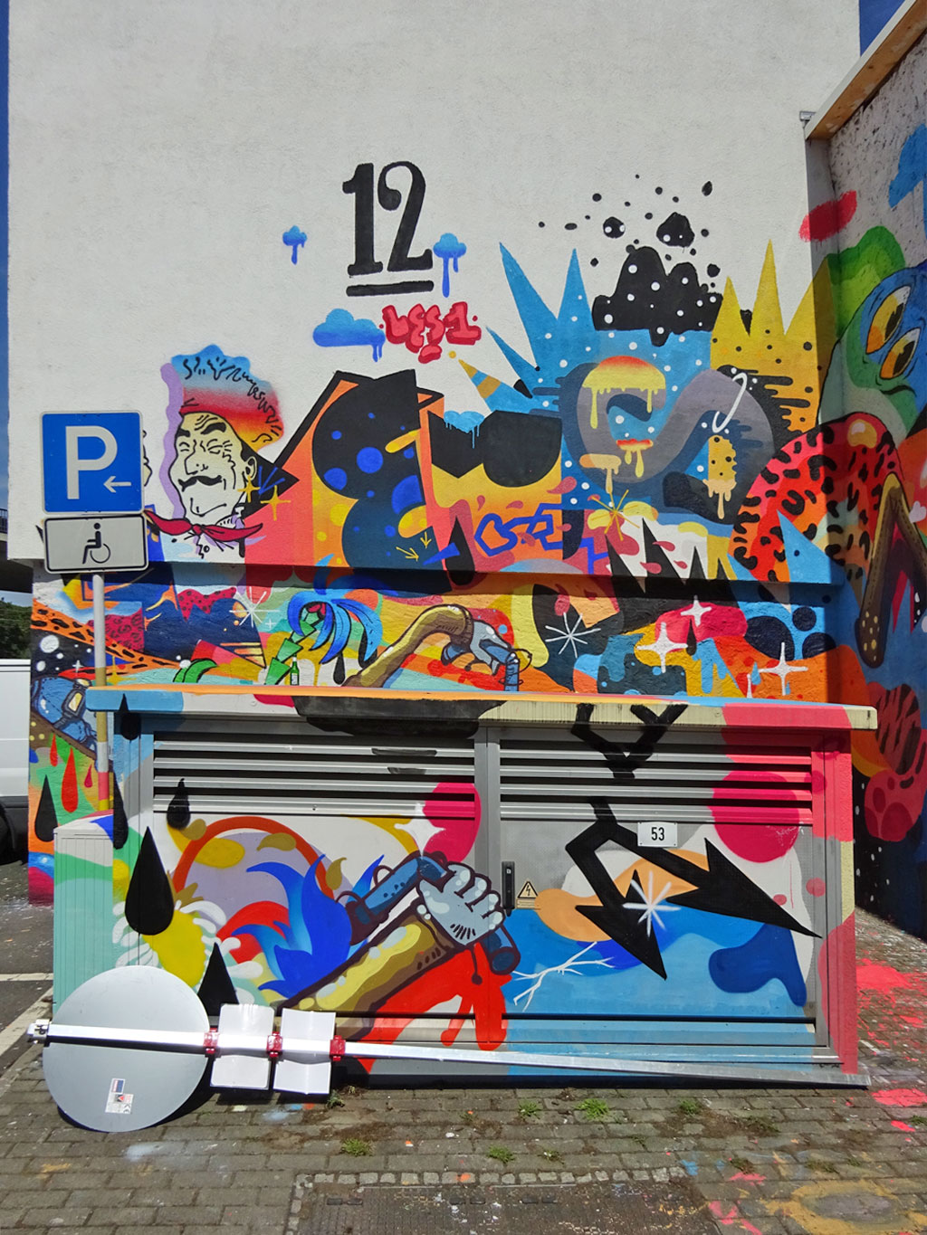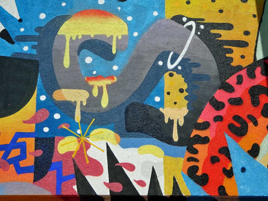 Die aus der Schweiz stammenden Cédric Kesa, Inso Mundo, Les Uns und The Little Brother haben sich bei diesjährigen Meeting of Styles-Festival in Wiesbaden die Wände eines Hauses in unmittelbarer Nähe zum Brückenkopf vorgenommen und dort ein knallig buntes Werk erschaffen.