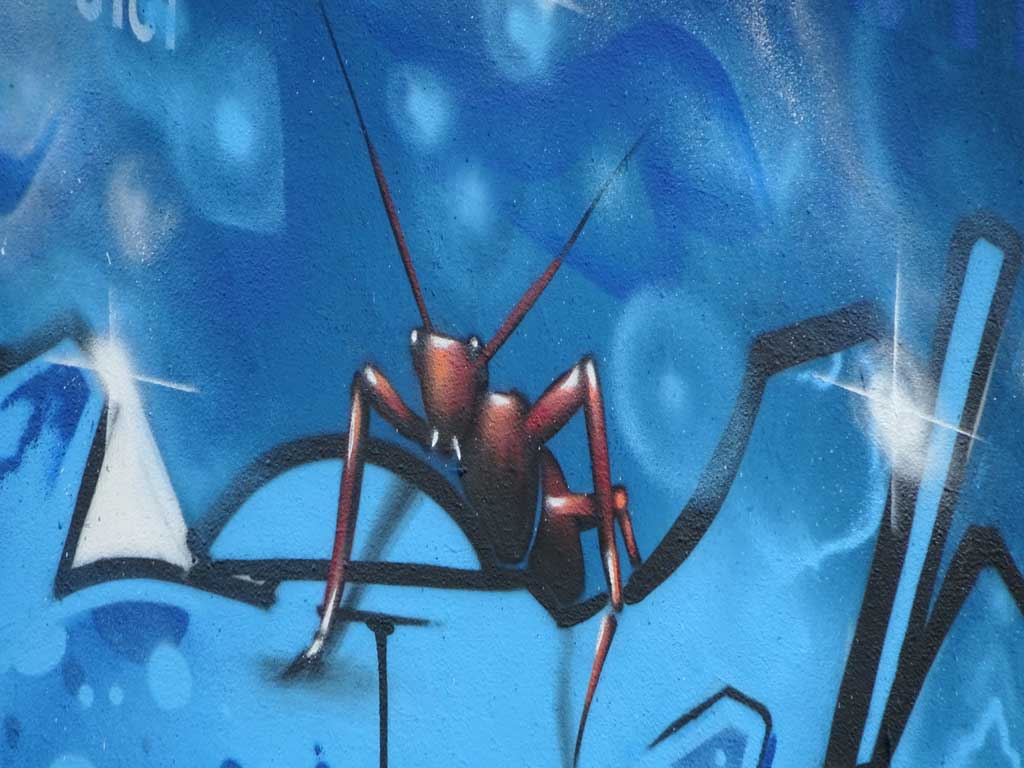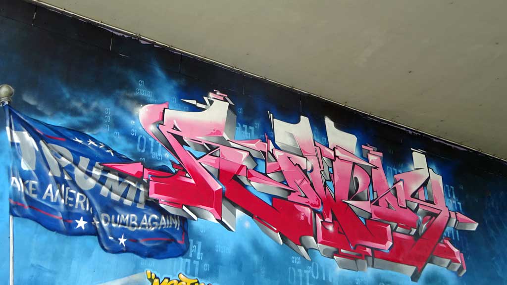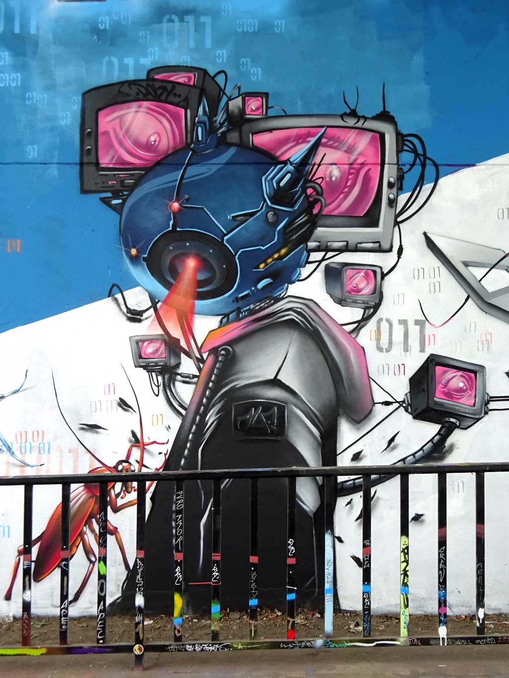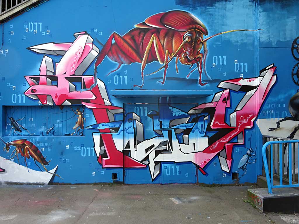 Für das auf den Fotos zu sehende Mural fanden sich folgende Künstler zusammen: Mad Flava Team (Deutschland), OBG (Belgien), Reasm (England), Skoc (Serbien), TV-Crew und Vanz (Brasilien).