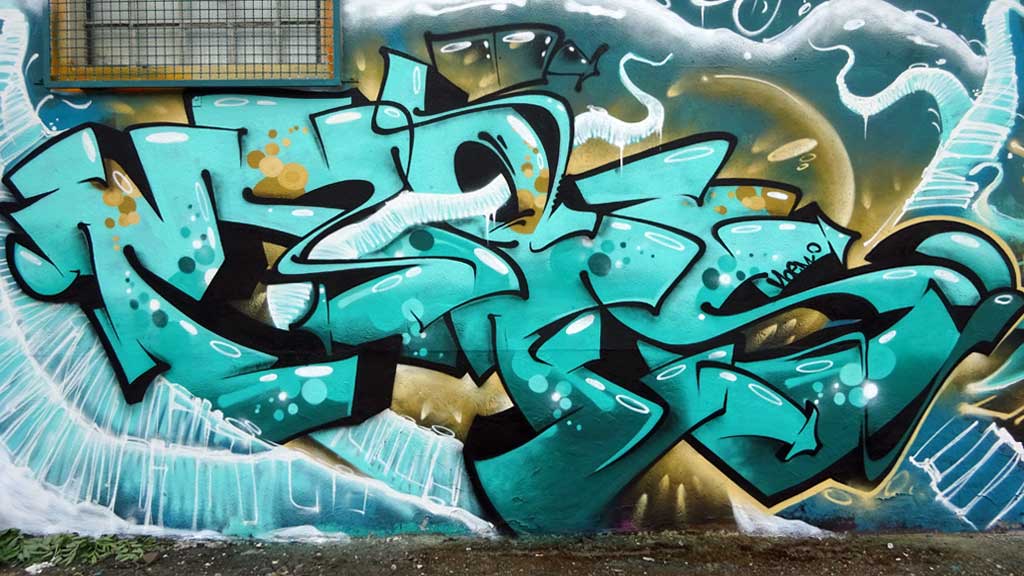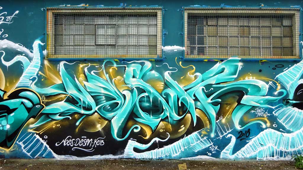 Anfang Juni war das Areal rund um den Brückenkopf in Mainz-Kastel zum wiederholten Mal Schauplatz für das „Meeting Of Styles“. Zu diesem Graffitikunstfestival in der hessischen Landeshauptstadt waren rund 100 Künstlerinnen und Künstler eingeladen, die über mehrere Tage hinweg die dafür vorgesehenen Flächen neu bemalt haben. An der Frontseite dieses kleinen Gebäudes waren Moes, Desan und Keib aktiv.