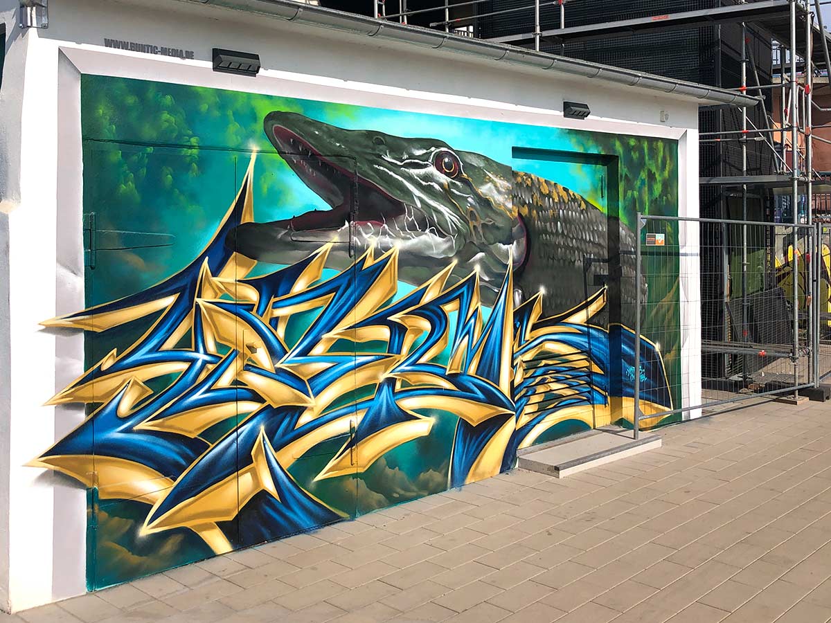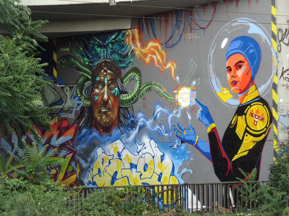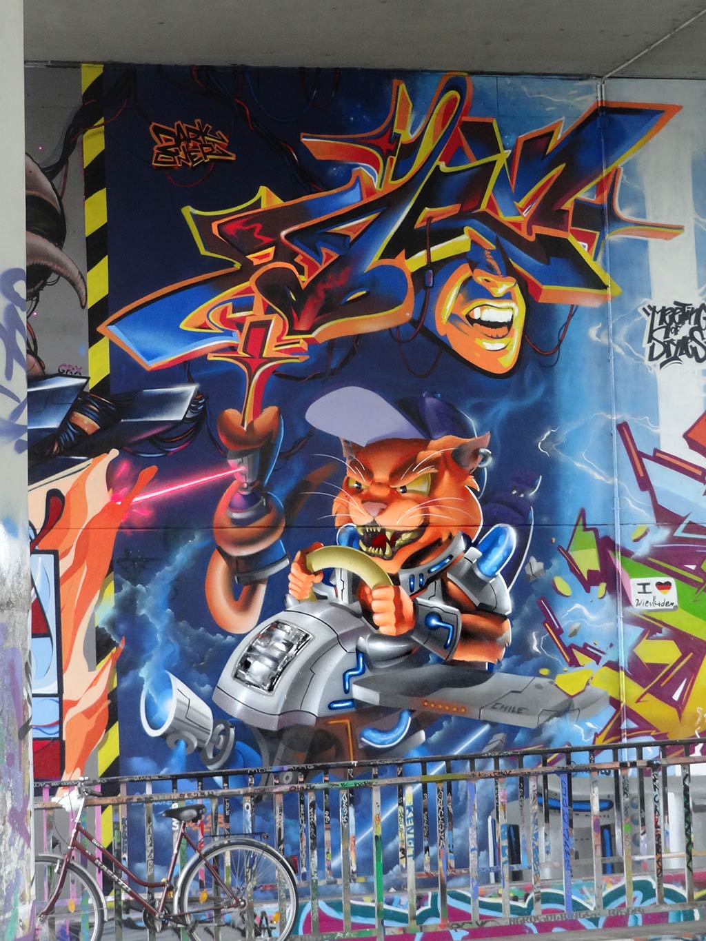 Hier eine weitere Ladung mit Fotos von den Malereien anlässlich des Graffitikunstfestivals Meeting of Styles 2023 in Wiesbaden (Mainz-Kastel). Die Wände entlang der neuen Multisportanlage sind auch bemalt worden, u. a. von Applezman, Mads Sonne, Ollio, Punta und Tom Magarian.