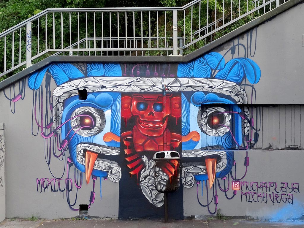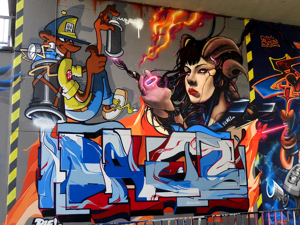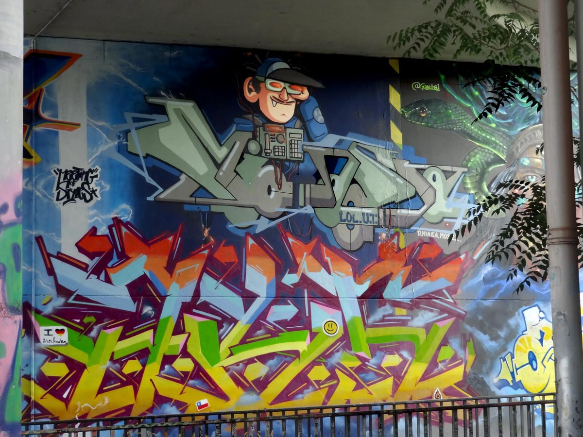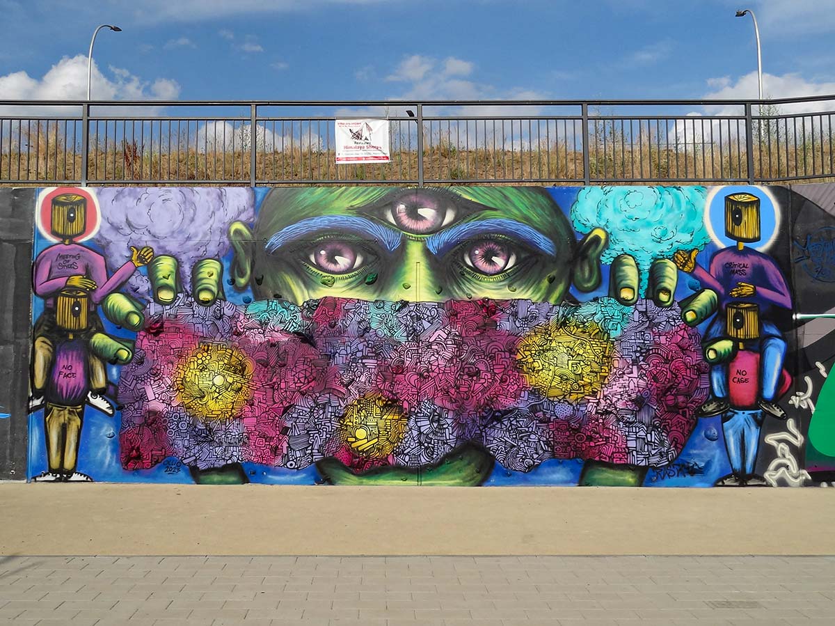 An der großen Fläche direkt am angrenzenden Parkplatz waren u. a. die folgenden Künstler*innen aktiv: Micky Vega, Force of Nature, Slizer One, Dael, Zark Oner, Kolor Espacial, Dmitry Miasa, Mr. Ans, Giancarlo Bernabe, Acton und Tristan Menard.
