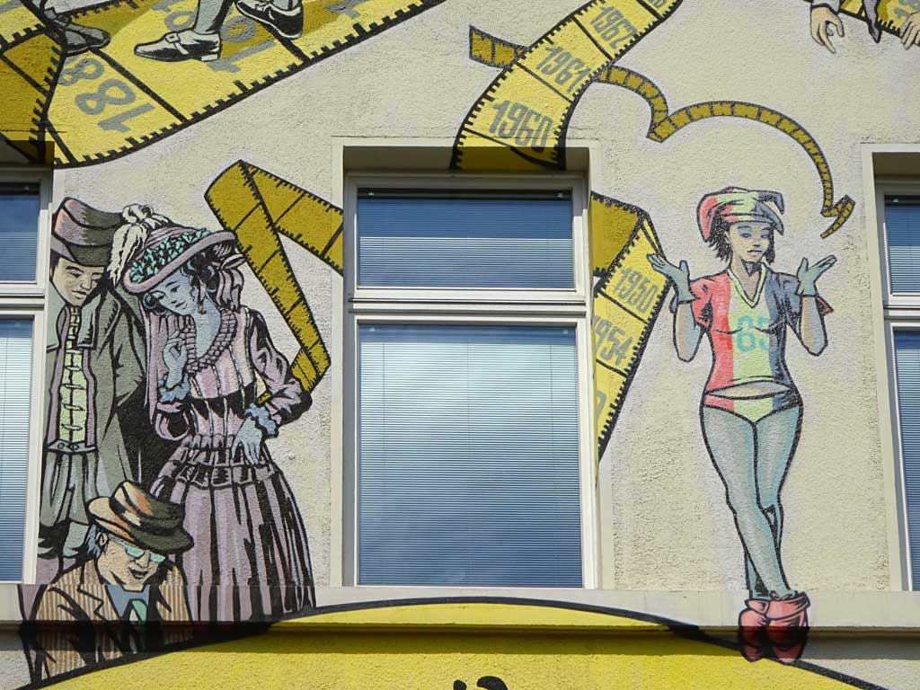 Das gelbe Maßband mit den Jahreszahlen und die unzähligen Figuren illustrieren die Geschichte des Maßschneiderhandwerks sowie die Mode der jeweiligen Zeit.