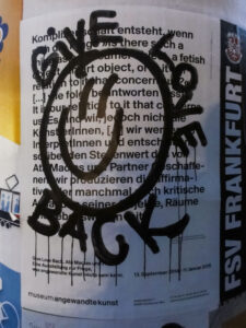 Zehn Jahre nach dem Ausstellungsprojekt „Give Love Back“ im Museum Angewandte Kunst rückt vom 25.6. bis 29.6.2025 24.8.2025 an gleicher Stelle das dazugehörige Plakat von Sandra Doeller, Graziano Capitta und Matthias Wagner K erneut in den Fokus – diesmal im Rahmen des Pop-up-Formats „Give Love Back Again“. Das Motiv hat seitdem eine erstaunliche Verbreitung erfahren: Es tauchte – mal komplett, mal nur einzelne Elemente – auf Socken, T-Shirts, Tattoos, Tassen, Protestplakaten und vielem mehr auf. Sogar im chinesischen Onlineshop Temu bin ich im vergangenen Jahr darüber gestolpert. [Frankfurter Ausstellungshäuser sollten generell viel mehr und öfter auch eigenes Merch anbieten – zum Ausstellungsort selbst wie auch zu den Ausstellungen. Da passiert mir viel zu wenig.]