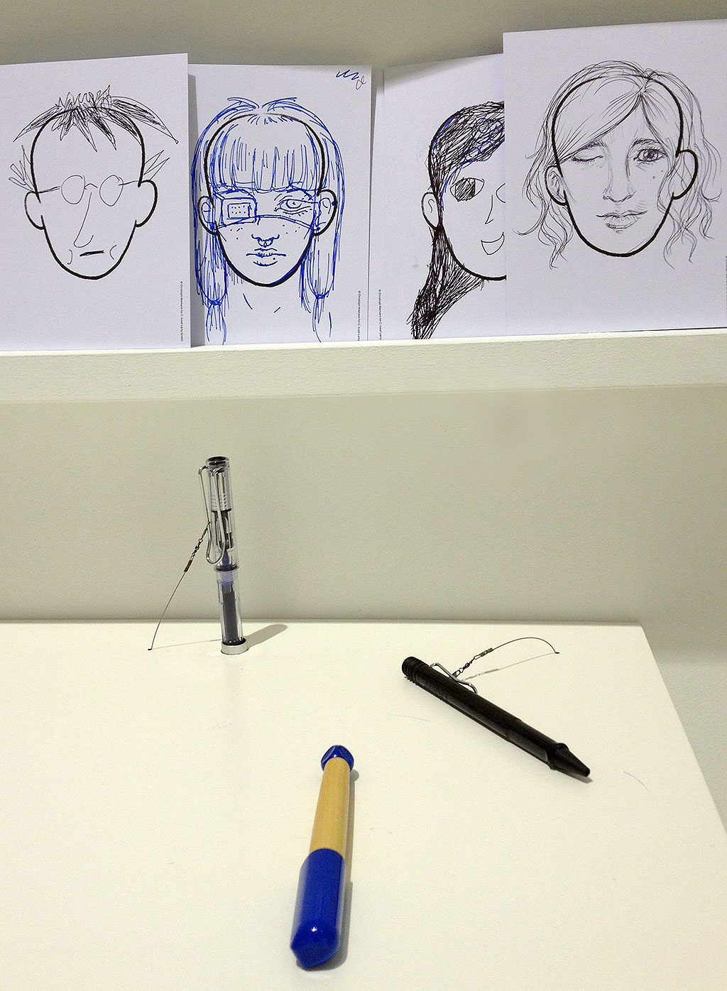 In einem weiteren Bereich der „Thinking Tools“-Ausstellung liegen Karten zum Mitmachen aus. Mit den entsprechenden Stiften können die Besucher zum Beispiel zwei vorskizzierte Kopfformen nach eigenem Gusto vollenden oder auch ein Thinking Tool kreieren. Hier einige Beispiele:
