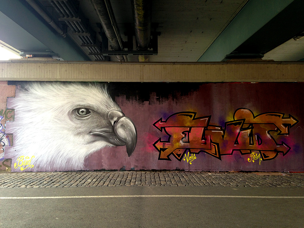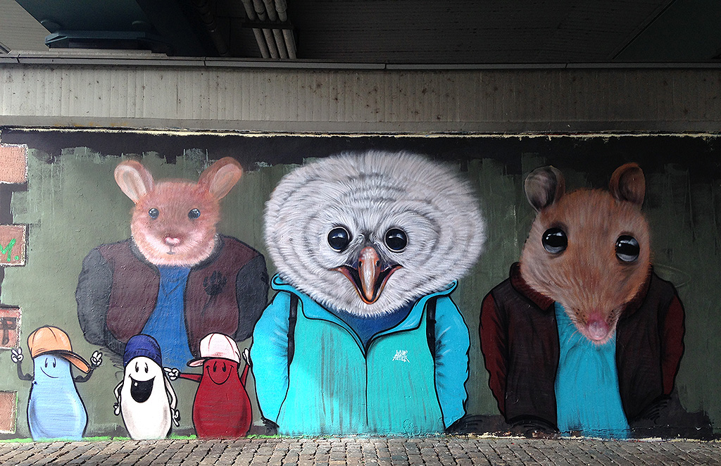 An der Friedensbrücke in Frankfurt wurde wieder gemalt. An zwei der vier für legales Graffiti freigegebenen Flächen entstanden neben einigen Namen auch sehenswerte Character, vor allem Wesen mit menschlichem Körper und tierischem Haupt, aber auch ein mit Elvistolle versehenes Konterfrei sowie ein Hase, dessen Darstellung mich ein wenig an die Demon Worms aus dem Anime Princess Mononoke erinnert.