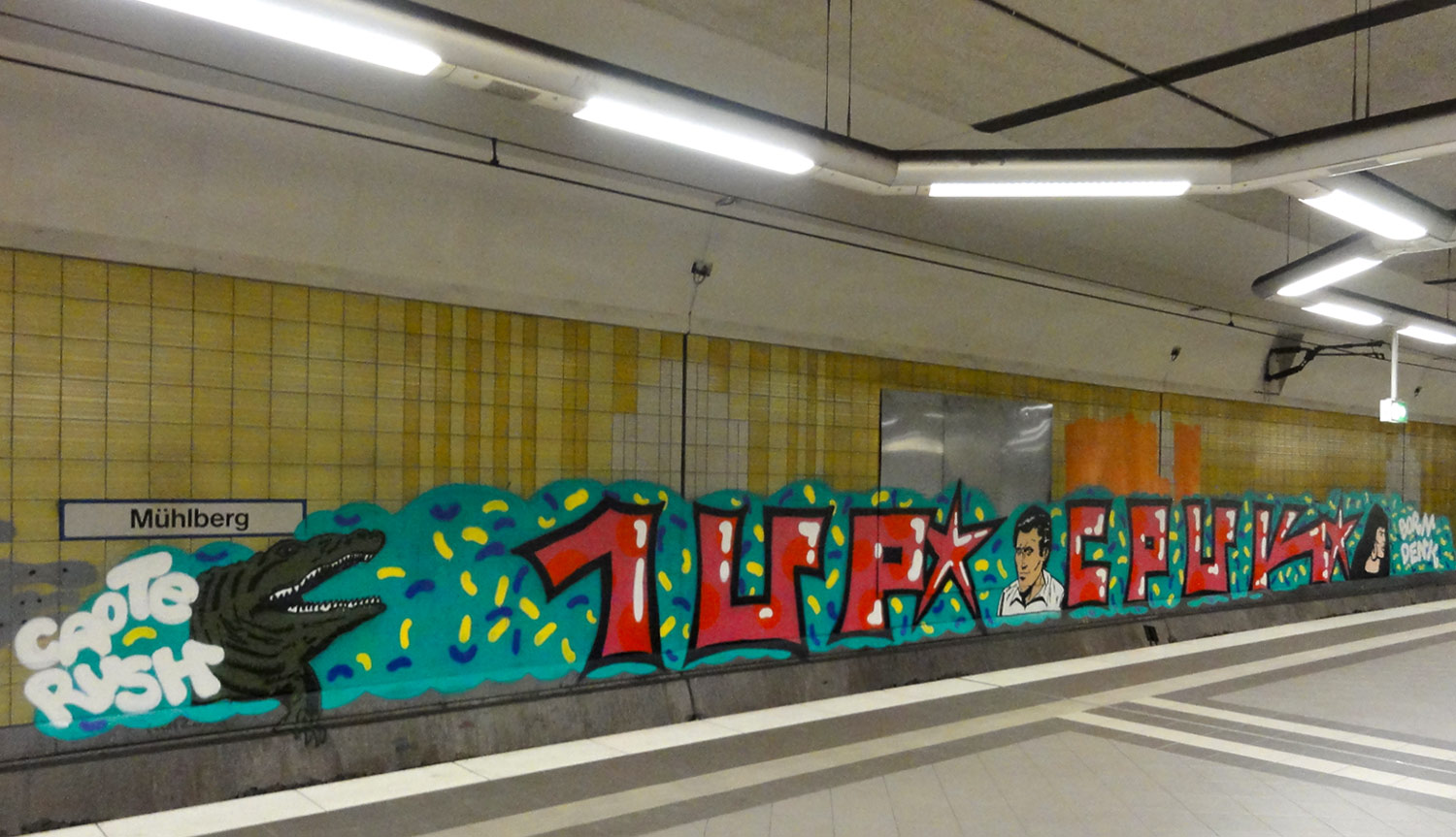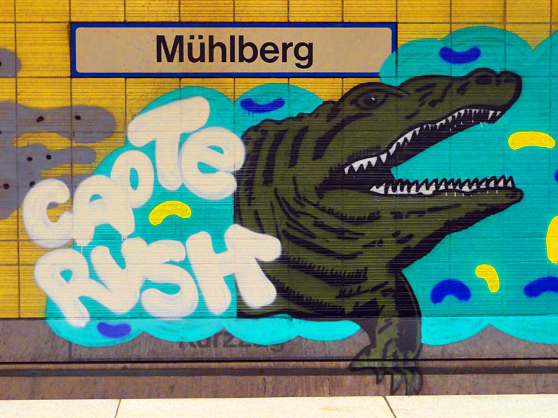 Die Qualität der Fotos lässt leider zu wünschen zu übrig, aber an sich das Piece mit den zwei Gesichtern und dem Krokodil, das aktuell in der S-Bahn-Station Mühlberg zu sehen ist, dennoch zeigenswert.