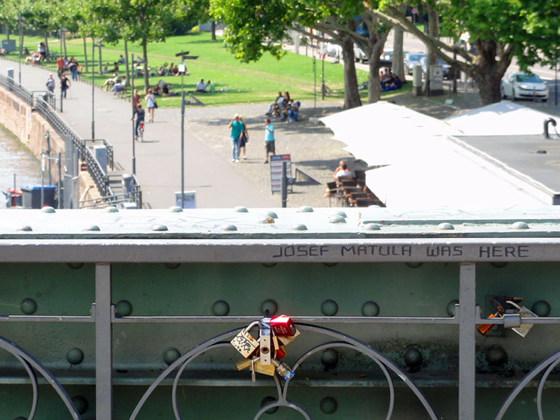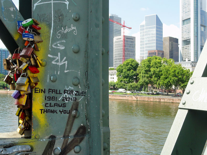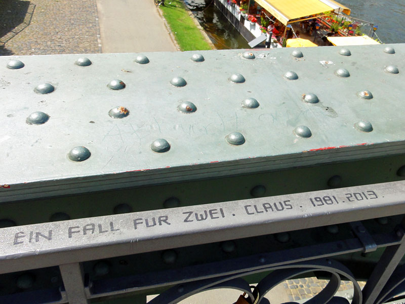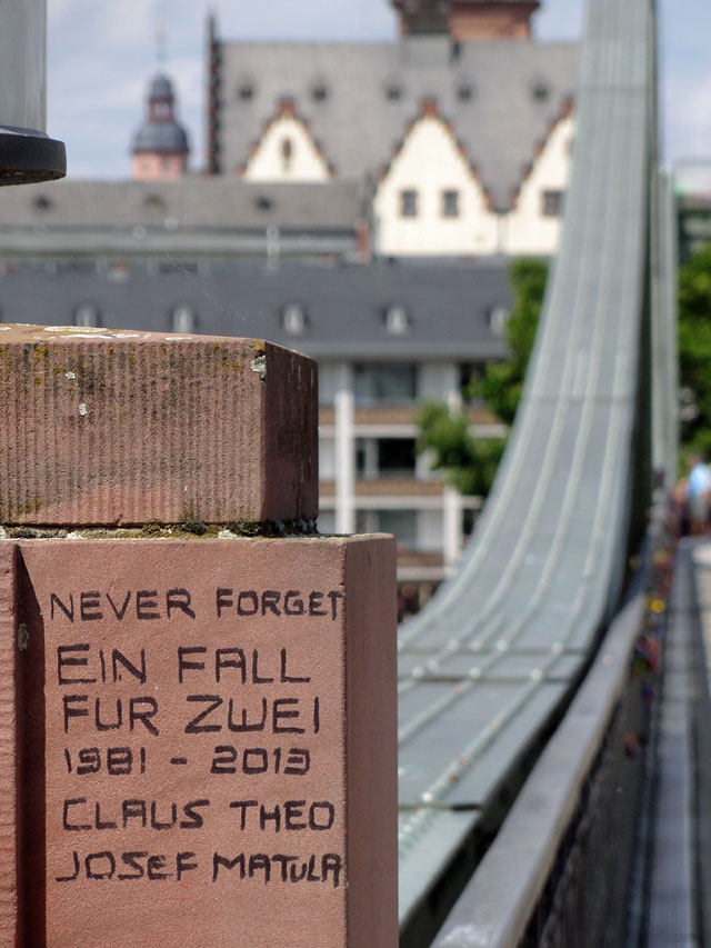 Dem „Ein Fall für zwei“ und seiner zur Kultfigur avancierten Figur Josef Matula hat sich offenbar ein großer Fan dieser Serie am Eisernen Steg in Frankfurt angenommen und mit seinem Marker, zwischen all den Liebesschlössern, einiges an Dankes- und Erinnerungs-Bekundungen hinterlassen.