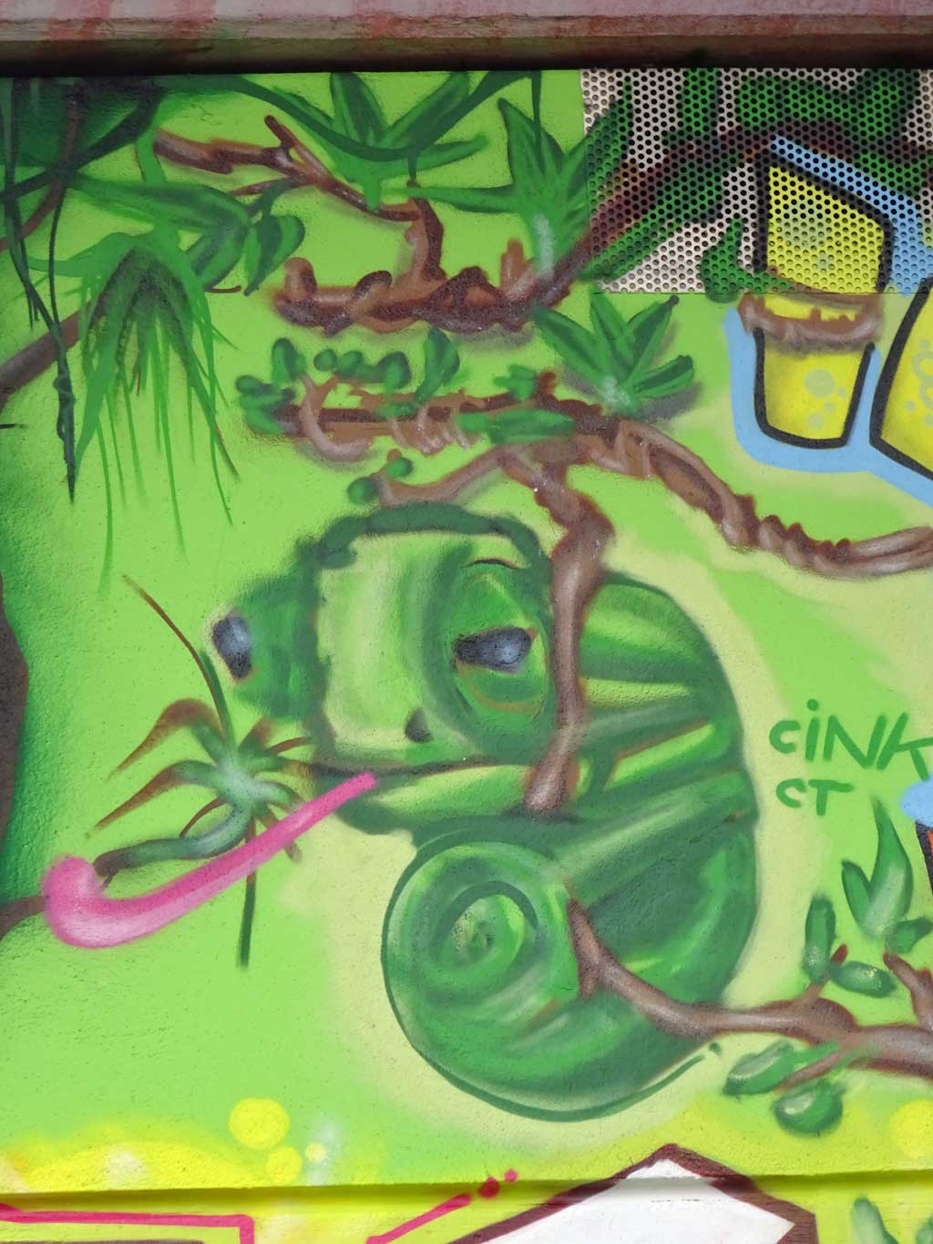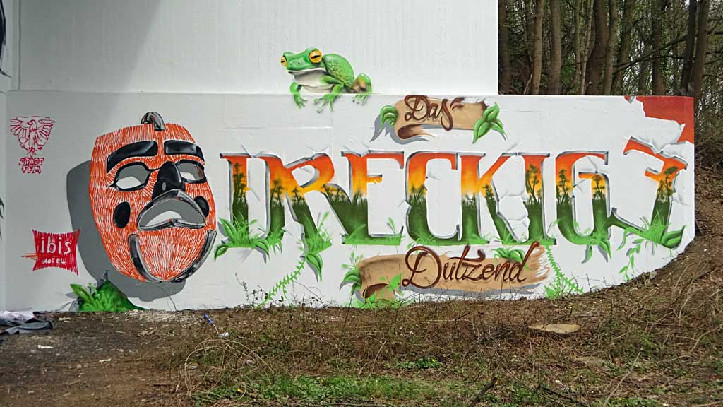 Das Dreckige Dutzend ist eine wechselnde Zusammenstellung von Urban-Art-Künstlern, die einmal im Jahr zusammen eine öffentliche Fläche gestalten. So wurde unter dem Motto „Welcome to Frankfurt“, bereits im April 2017 eine Fläche an der Breitenbachbrücke bemalt. In diesem Jahr wurde das Projekt an neuer Stelle fortgesetzt, und zwar an zwei Wänden unterhalb der U-Bahn-Haltestelle „Niddapark“. Motto in diesem Jahr: Großstadtdschungel.