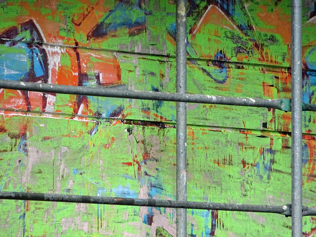 Mir ist zwar bekannt, dass Flächen, die neu bemalt werden, vorher auch mal mit einer Farbe übermalt werden, bevor es an das eigentliche Werk geht, aber dass, wie es jetzt aussieht, zunächst etwas entfernt wird, nicht. Ebenso ist mir allerdings nicht bekannt, ob bei Graffitientfernung irgendwie in mehreren Schritten, eine Schicht nach der anderen, gearbeitet wird und dabei auch Gerüste zum Einsatz kommen. Das Gerüst ist jedenfalls von „Gerüstbau Paul“, wie auch schon bei der Entstehung des „Großstadtdschungel“-Murals.