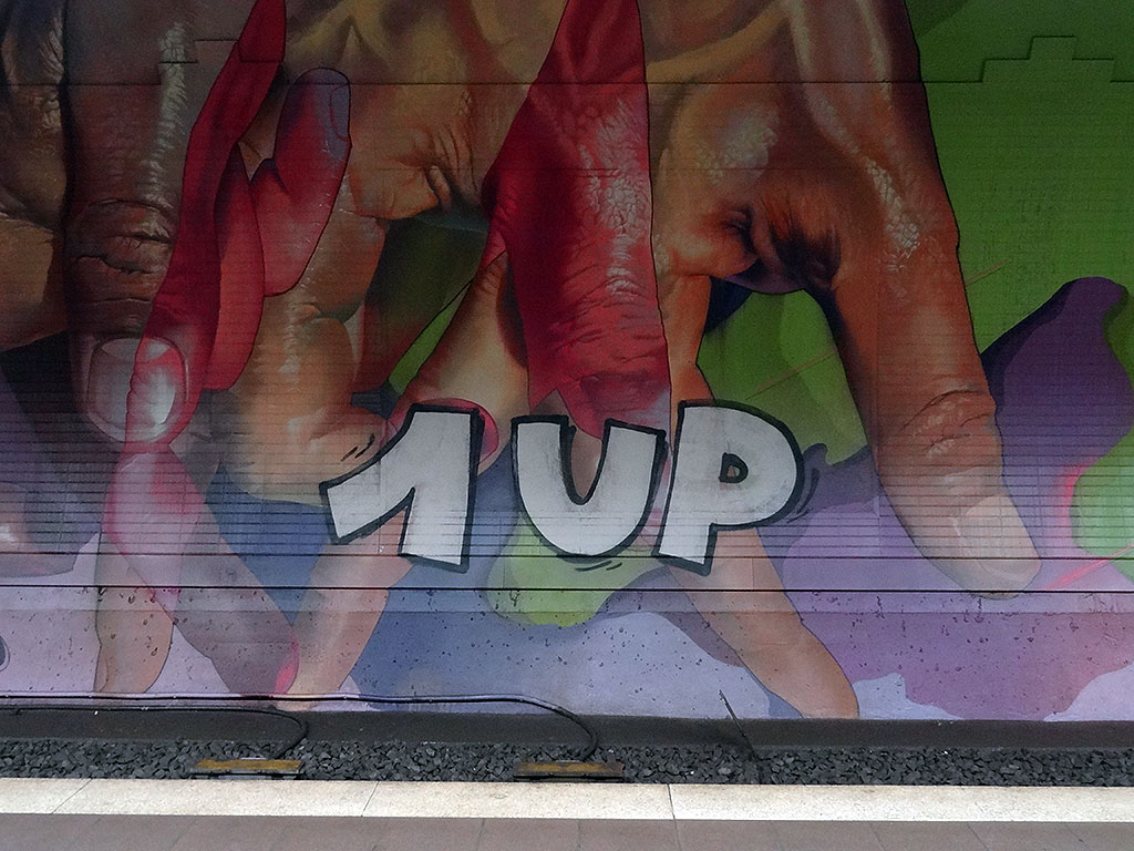 Ungeachtet dessen, und im Gegensatz zu vergleichbaren Umsetzungen an Häusern, die dann nur noch vereinzelt bis gar nicht mehr übermalt werden, wird an der Haltestelle in Nähe des EZB-Neubaus doch wieder in die frisch bemalten Wandgestaltung gesprüht.