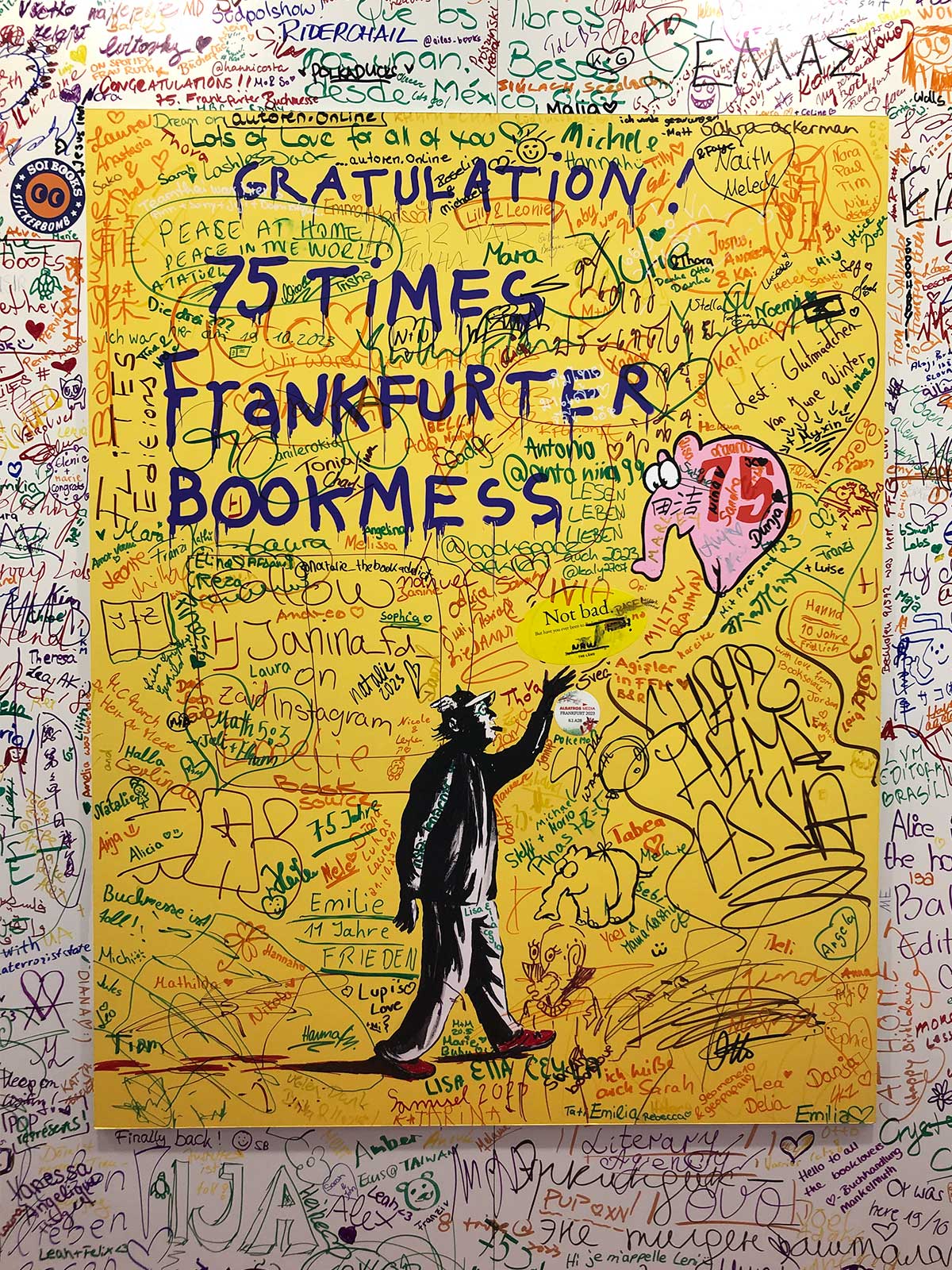 Auf der Frankfurter Buchmesse war eine große Mal-/Schreibwand aufgebaut, auf die man eine Skizze malen oder Nachricht hinterlassen konnte. Auf derselben Wand war auch ein Bild angebracht, auf der mit einer Otto-Waalkes-Interpretation des berühmten „Girl with Ballon“-Bildes von Streetart-Künstler Banksy der „Frankfurter Bookmess“ zum 75. Geburtstag gratuliert wird. Hier zwei Fotos von diesem Bild: das erste aufgenommen am Freitag, das zweite am Samstag.