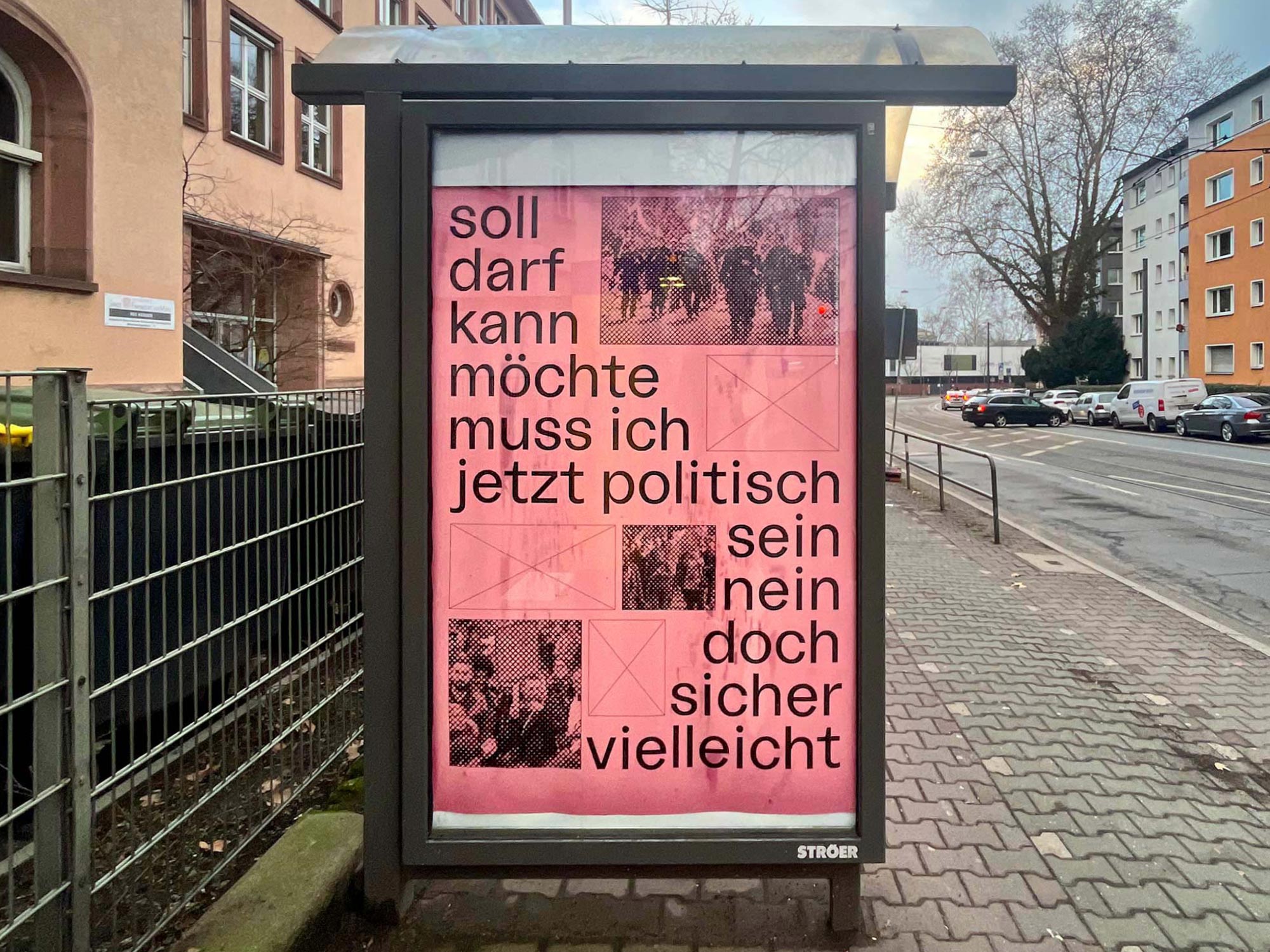 Ein Artikel, der gestern in der Frankfurter Rundschau erschien, zeigt vier Plakate, darunter auch die beiden, die hier zu sehen sind, und verweist dabei auf das mir bisher unbekannte Kollektiv Kleistermeister:innen (Instagram: @kleistermeister_innen), mit dem man sogar kommuniziert hat. Das finde ich insofern kurios, wenn nicht sogar befremdlich, da mindestens zwei dieser Plakate aus der Aktion „Plakate gegen Rechts“ stammen – nämlich „D IE AFD ISTE INSCH EISSVE REINUND … …“ und „soll darf kann möchte ich muss ich jetzt politisch …“ – es steht ja sogar, sehr klein geschrieben, auf den Plakaten! Jede*r, der*die diesen FR-Artikel gelesen hat, wird davon ausgehen, dass wer solche Aktionen durchführt, natürlich auch diese Plakate gestaltet hat, das sind ja keine Aufkleber, die es irgendwo zum Mitnehmen gibt oder verteilt werden und von x-beliebigen Personen verklebt werden können. Auch wenn die Sichtbarkeit dieser Plakate, vielleicht nicht unbedingt in solchen Leuchtkästen, das Anliegen der Aktion ist, sollte man nicht verschweigen, was und wer bei einigen Plakaten dahintersteckt, also sei es die Aktion an sich als auch die einzelnen Gestalter*innen.