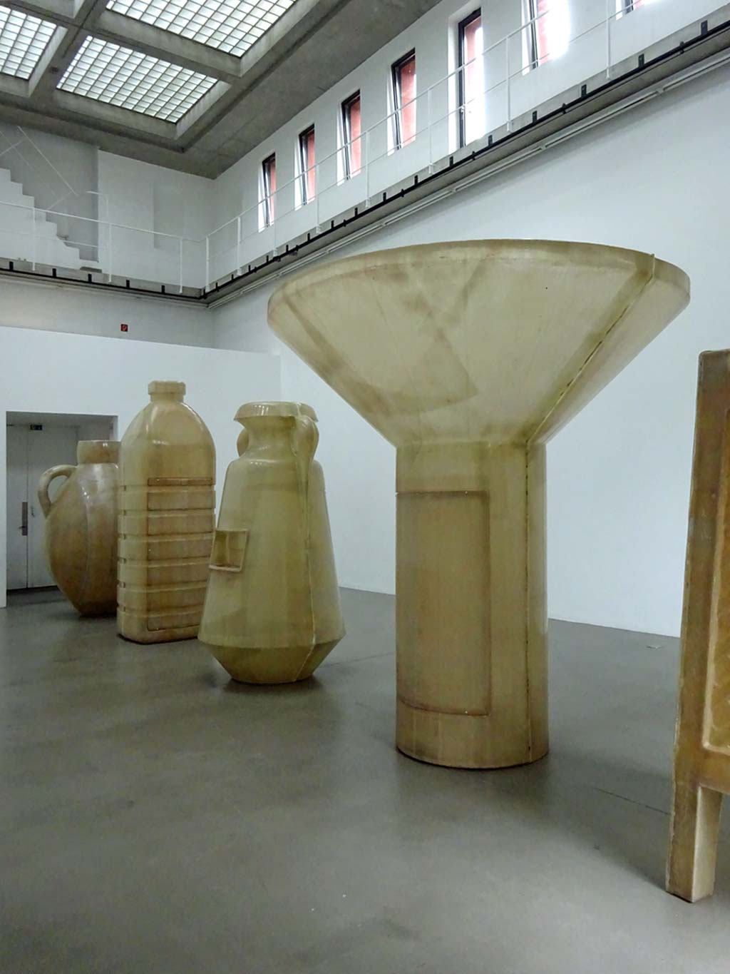 Der Portikus präsentiert in „In lieu of what was“ eine Ausstellung der kuwaitisch-puerto-ricanischen Künstlerin Alia Farid. Zu sehen ist eine Gruppe großformatiger Skulpturen, die Brunnen in Form unterschiedlicher Gefäße, die zum Transport und zur Aufbewahrung von Wasser dienen – vom traditionellen Tonkrug bis hin zur allgegenwärtigen Plastikflasche – darstellen sollen. Die 34-jährige Künstlerin wählte diese Behältnisse mit Blick auf die Beziehung zum Wasser in der Wüste und dem Wandel im Anbetracht der wachsenden Wasserknappheit, die mit dem Ausbau der ölzentrierten Industrie einhergeht.