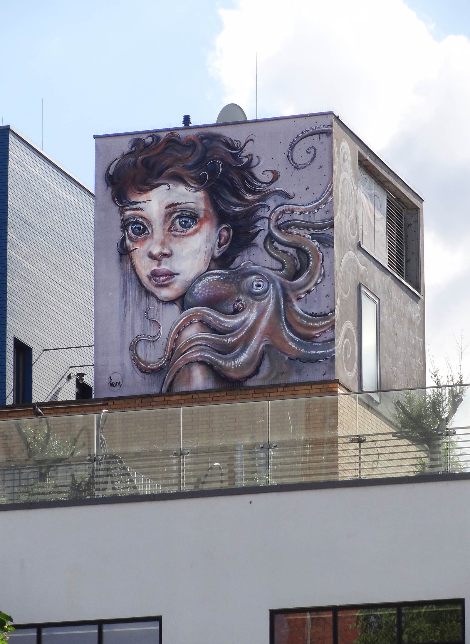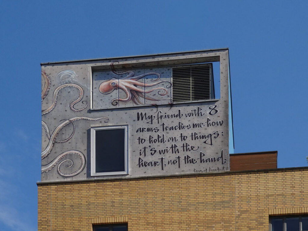 Das Rooftop-Bild von Jasmin Siddiqui, so der bürgerliche Name der (Mural-Art-)Künstlerin zeigt das Gesicht eines Kindes oder zumindest das, einer jungen Person, dazu zwei unterschiedlich große Kraken und einen für ihre Arbeiten typischen Spruch, der in diesem Fall wie folgt lautet: „My friend with 8 arms teaches me how to hold on to things: it’s with the heart, not the hand.“