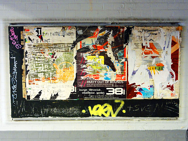 Auf eine lange Verweildauer in den Straßen können sich die unterschiedlichsten Street Art-Werke in Frankfurt nicht verlassen. Selbst dann nicht, wenn sie im Rahmen von Ausstellungen etablierter Kunsthäuser höchst offiziell angebracht wurden. Gibt es Werke, die von solchen Schicksalen lange, oder gar generell, verschont bleiben, sehen diese mit der Zeit entsprechend mitgenommen aus. Ein Zustand, bei dem sogar manch übereinandergeklatsche Werbepampe ein interessantes Erscheinungsbild abgibt.