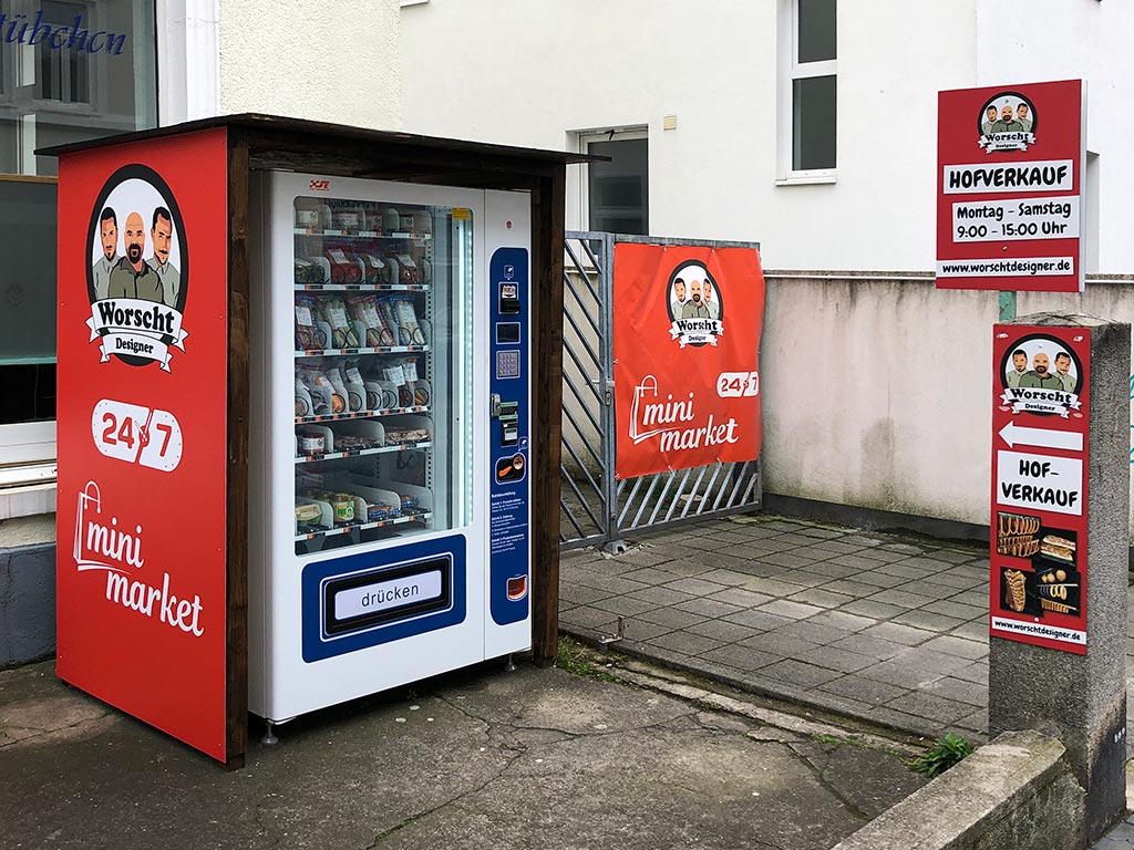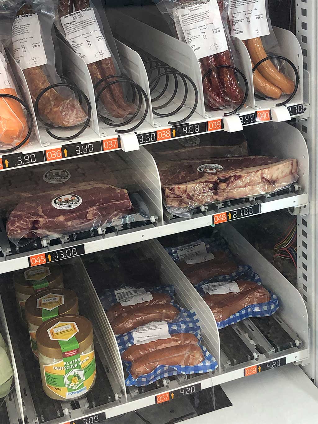 Die Worscht Designer in Frankfurt stellen Fleisch- und Wurstwaren her. „Wir stellen nur Produkte her, die wir auch selbst gerne essen wollen”, heißt es dazu auf ihrer Website. Angeboten werden diese Waren von Montag bis Samstag von 9 Uhr bis 15 Uhr in ihrem Hofmarkt in der Martin-May-Straße 11 in Sachsenhausen. Seit einigen Wochen bieten die Worscht Designer eine weitere, ungewöhnliche Möglichkeit an, bei ihnen einzukaufen, und das sogar rund um die Uhr: Sie haben einen Automaten aufgestellt und diesen mit Fleisch- und Wurstwaren, aber auch Eiern und Honig bestückt.