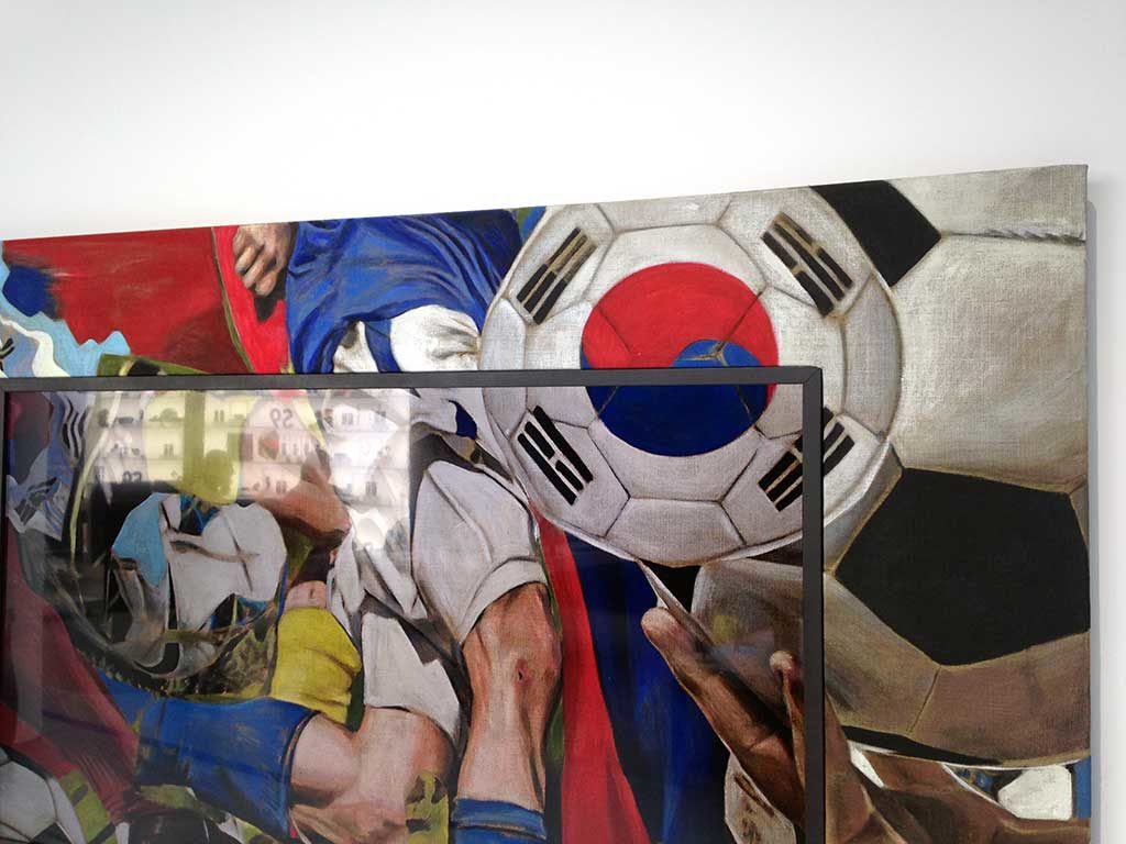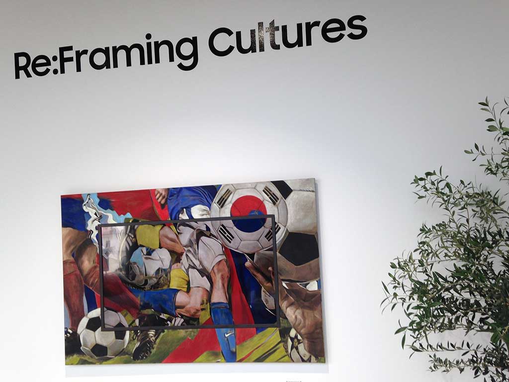 In Zusammenarbeit mit der Hochschule für Gestaltung Offenbach hat Samsung Electronics in seinem Showcase in Frankfurt auf der Zeil die Ausstellung „Re:Framing Cultures“ kreiert. Insgesamt neun Studierende zeigen mit ihren Beiträgen die interkulturelle Bedeutung des Fußballs auf und veranschaulichen, wie Technologie, hier anhand des Samsung Lifestyle-TV „The Frame“, und Kunst miteinander interagieren können. Ausführliche Infos zum Projekt sowie die Namen der beteiligten Personen sind auf der Samsung-Newsroom-Website Hochschule für Gestaltung Offenbach und Samsung feiern die Völkerverständigung durch Fußball aufgeführt. Die Werke werden im mittleren bis hinteren Bereich des Erdgeschosses präsentiert. Besonders interessant fand ich diese beiden Ausführungen: