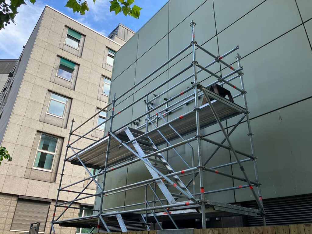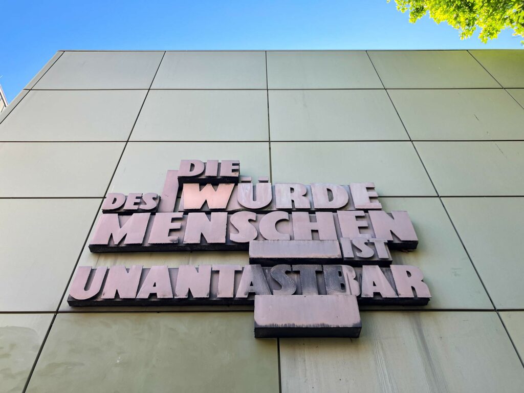 Die Frankfurter Staatsanwaltschaft ist in Gebäude C in der Konrad-Adenauer-Straße untergebracht bzw. war dies bis vor Kurzem, denn vor einigen Wochen haben die Bauarbeiten an jenem Gebäude C begonnen, da der gesamte Justizkomplex grunderneuert wird. Die umfassende Modernisierung wird etwa zwölf Jahre in Anspruch nehmen und umfasst neben der Sanierung und dem Umbau der bestehenden Gebäude auch die Errichtung von zwei Neubauten. Das zuvor erwähnte Gebäude C liegt keine fünf Gehminuten vom eingangs erwähnten Oberlandesgericht entfernt und dürfte das bekannteste Gebäude im Gerichtsviertel sein, denn an dessen Fassade erinnerte bis Anfang dieser Woche ein Kunstwerk am Bau ebenfalls an Fritz Bauer, nämlich der Schriftzug „Die Würde des Menschen ist unantastbar“. Der Satz aus Artikel 1 des Grundgesetzes, das am 23. Mai dieses Jahres 75 Jahre alt wurde, hing dort seit den 1960er Jahren und kein Geringerer als Fritz Bauer persönlich hat sich damals für das Anbringen dieses Schriftzuges eingesetzt.