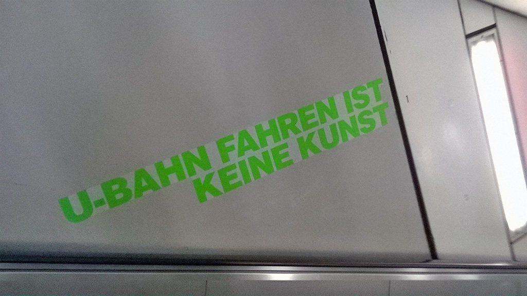 Entstanden sind diese Wandbeschriftungen im Rahmen der Neugestaltung im Jahr 2003, als sich VGF, Schirn Kunsthalle und Saatchi & Saatchi diesbezüglich zusammengetan hatten. Kürzlich hat jemand die Slogans thematisch aufgegriffen und an einer unbesetzten Werbefläche am Bahnsteig einen eigenen Text dazu hinterlassen: „Schwarzfahren ist Kunst“.