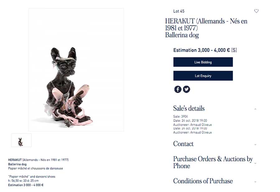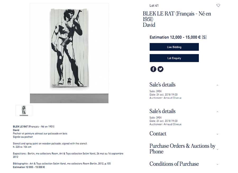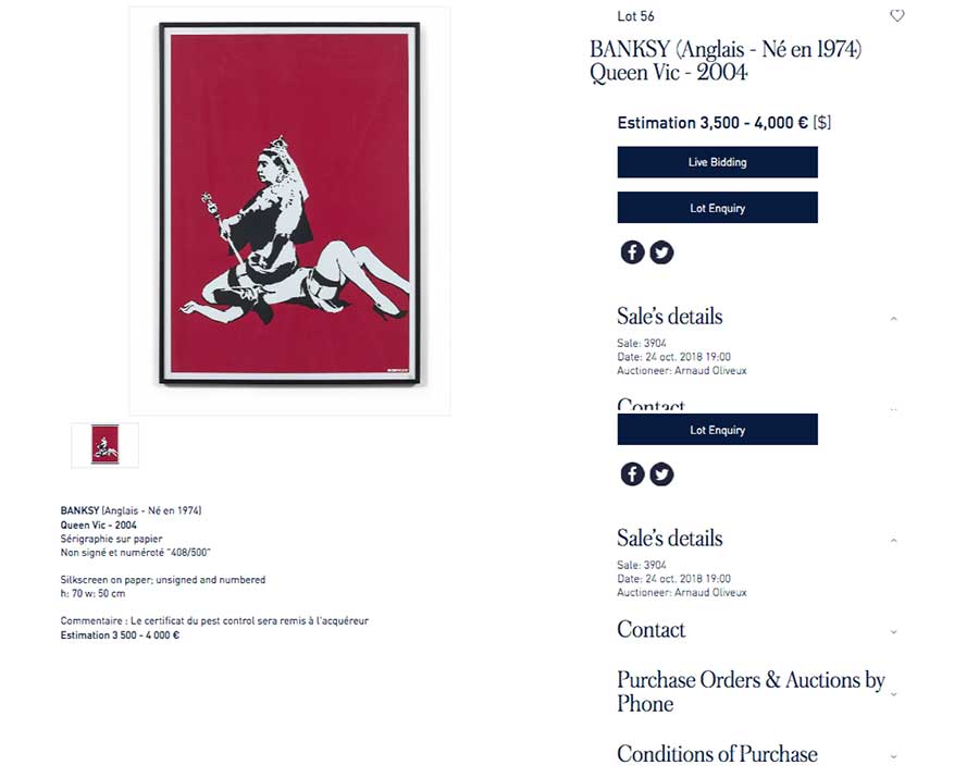Unter dem Titel „Search & Stop. Collecting from Banksy to Mark Ryden“ suchten am gestrigen Mittwochabend beim französischen Auktionshaus Artcurial über 100 Kunstwerke ein neues Zuhause. Angeboten wurden überwiegend Bilder und kleine Skulpturen, darunter auch mehrere Arbeiten von Banksy, dem bekanntesten Streetart-Künstler unserer Zeit.