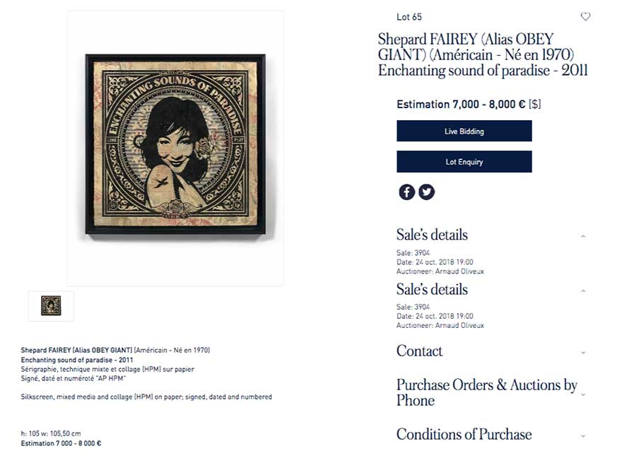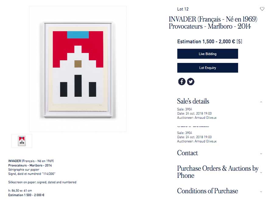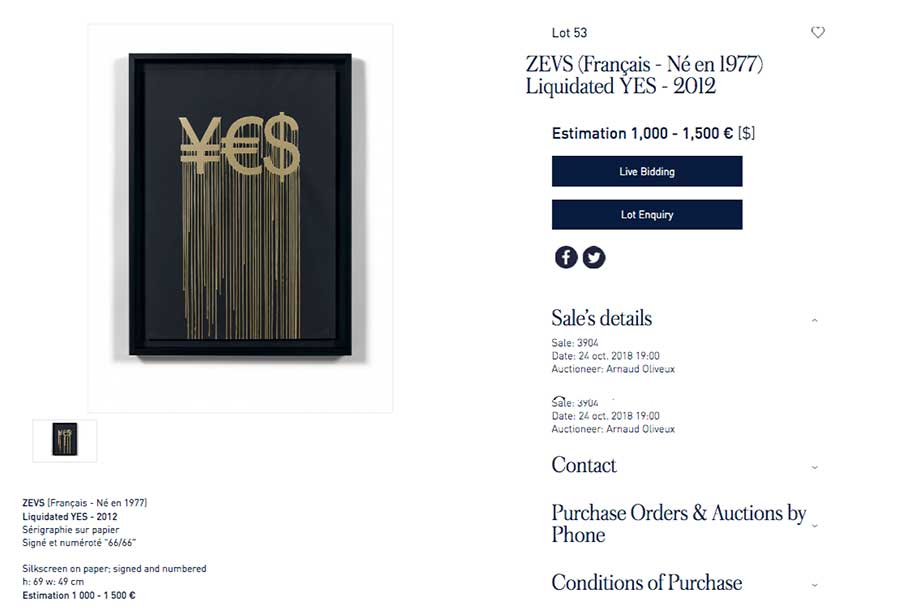 Angeboten wurden aber auch Arbeiten von anderen Künstler/innen, die sich ebenfalls mit Streetart einen Namen gemacht haben, z.B. Blek Le Rat, Herakut, Invader, J.R., Shepard Fairey, Taps & Moses und Zevs. Hier mal eine Übersicht zu welchen Kursen solche Werke gehandelt und verkauft wurden.