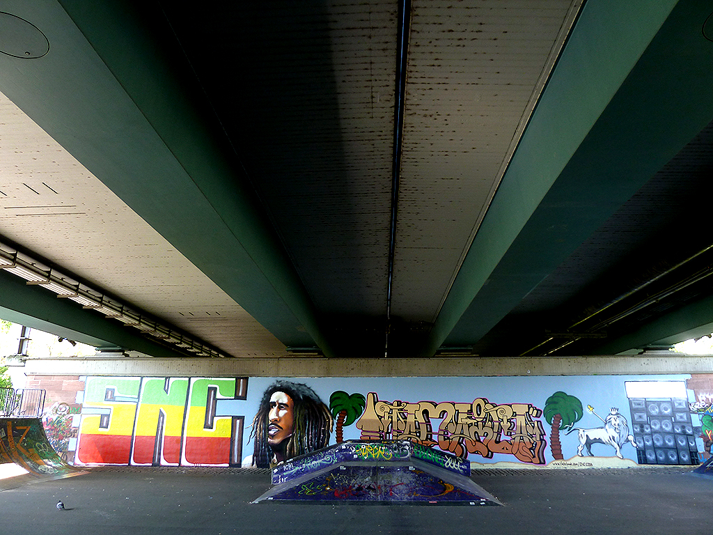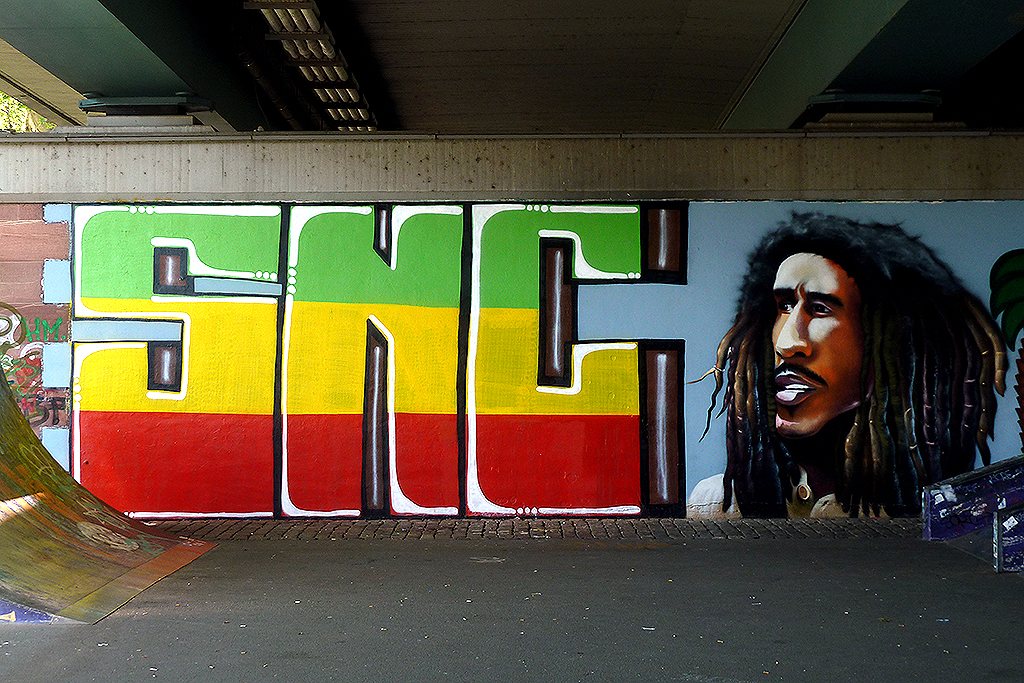 Die SNC-Crew hat sich mal wieder einer Wand an der Friedensbrücke in Frankfurt angenommen. Zu sehen sind die Farben der Rastafari-Bewegung, Bob Marley, der Iron Lion Zion und ein ordentliches Soundsystem.