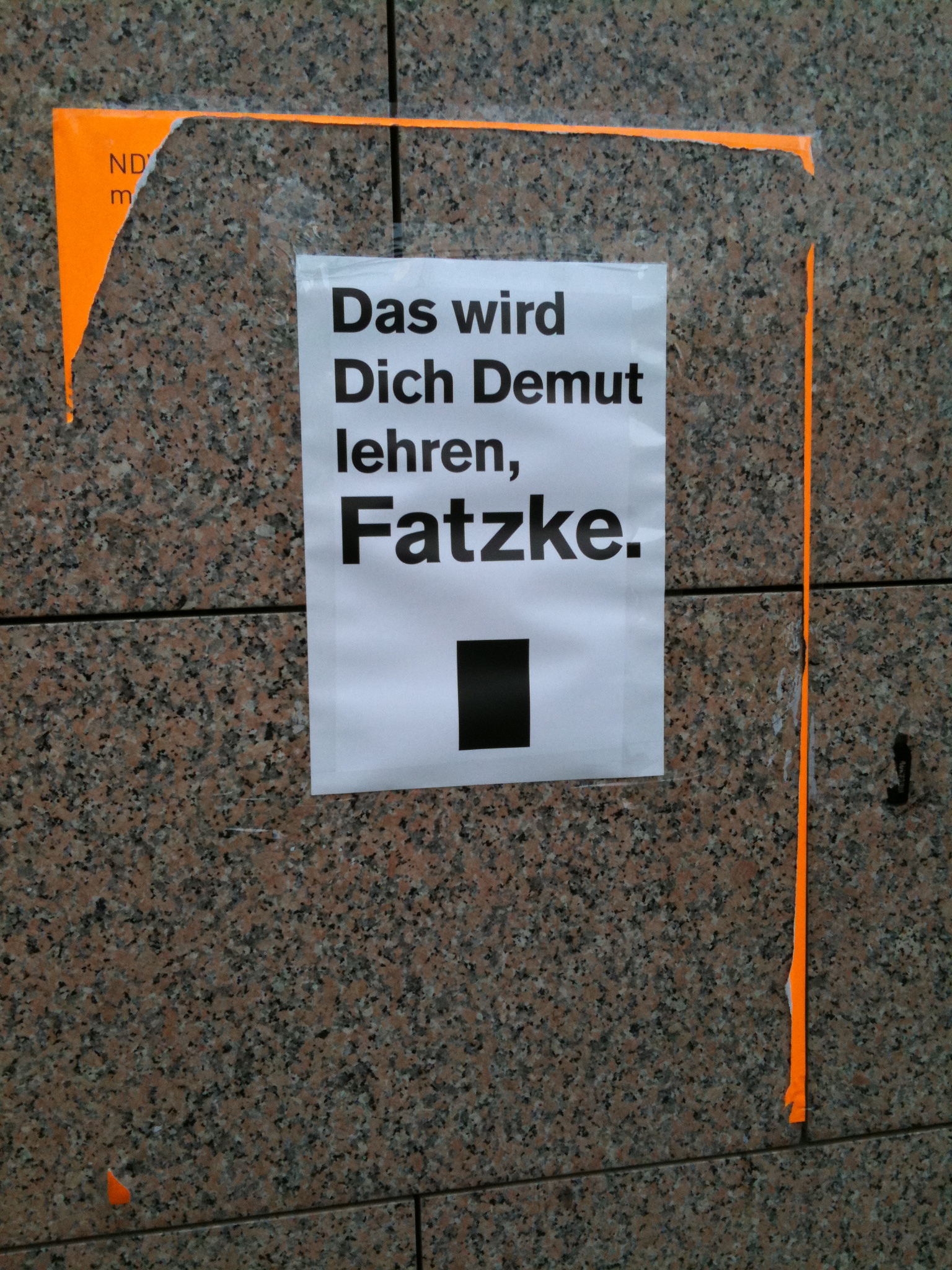 Seit einigen Tagen fallen mir in Frankfurt kleinere Plakate auf, die mit schwarz auf weiß gedruckten Sätzen versehen sind. Ich konnte diese zunächst nicht einordnen, aber das Interesse war geweckt. Zuerst sah ich letzte Woche das „Wie halten die Leute eigentlich ihr Leben aus?“, wenige Tage später das an etwas prominenterer Stelle, in der Berger Straße platzierte „Das wird Dich Demut lehren, Fatzke.“