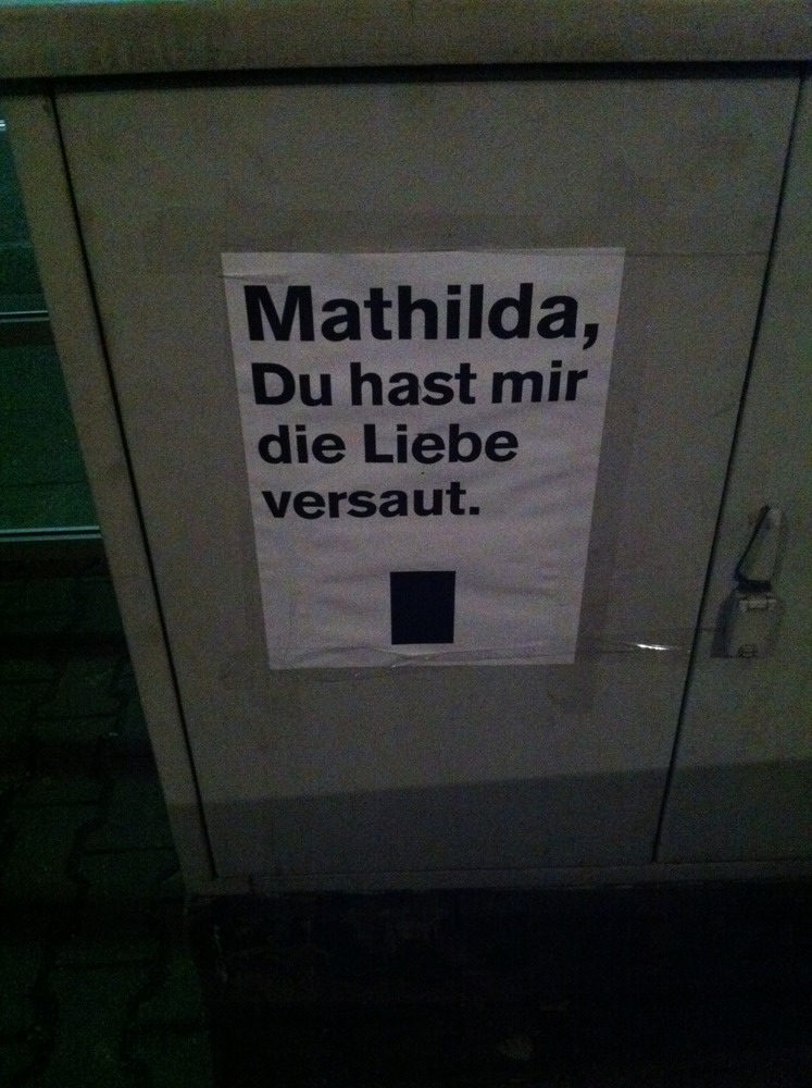 Interessanter Blogeintrag! Gefällt uns! Sehr sogar! Sind euch auch in letzter Zeit auch ominöse Plakate mit schwarzen Rechtecken und kryptischen Sprüchen ins Auge gesprungen? Postet eure Sichtungen hier auf unserer Pinnwand und gewinnt … sagen wir mal … schwarz-weiße, mit Buchstaben bedruckte, äußerst unterhaltsame dreidimensionale Rechtecke. :-)