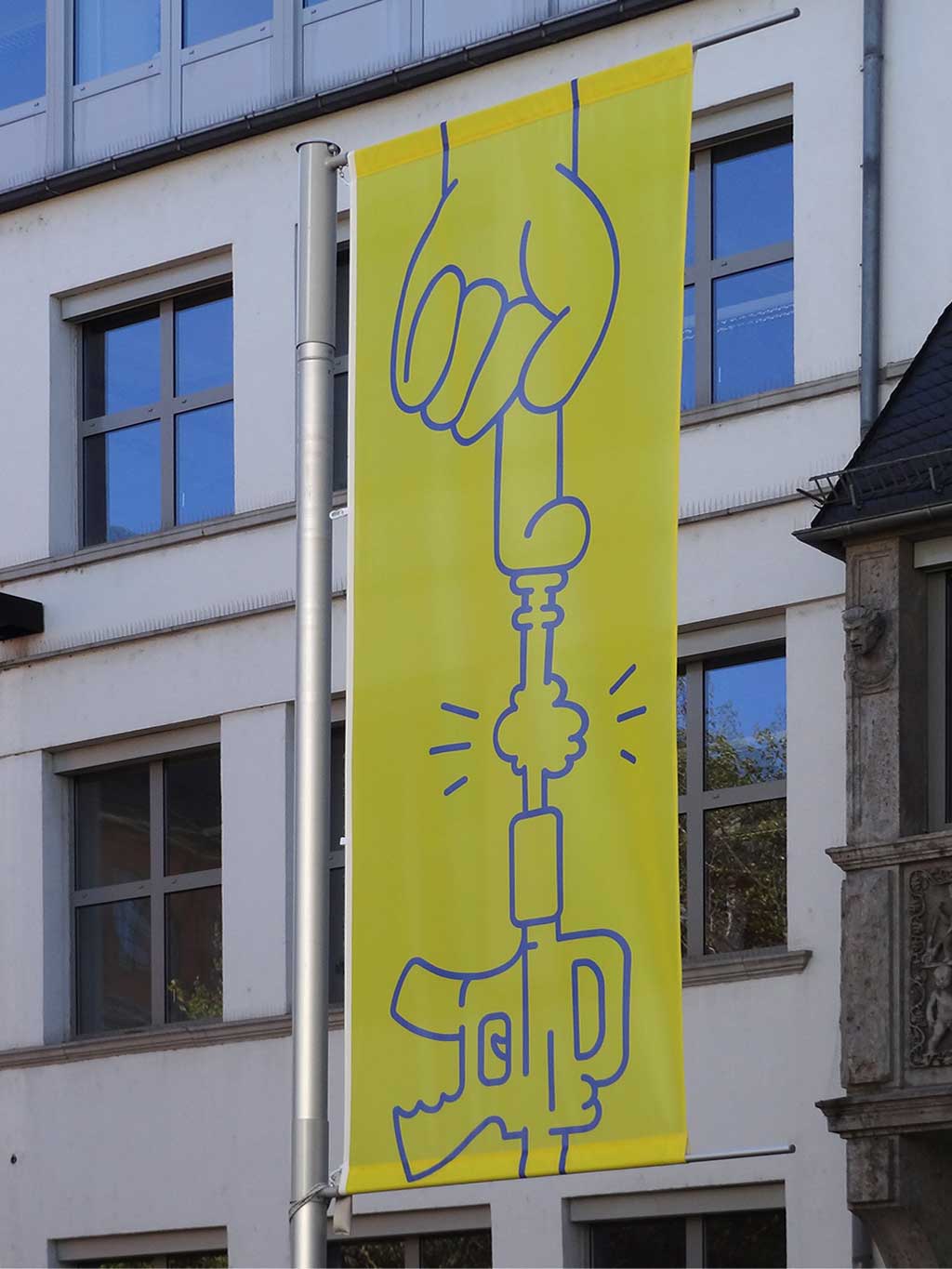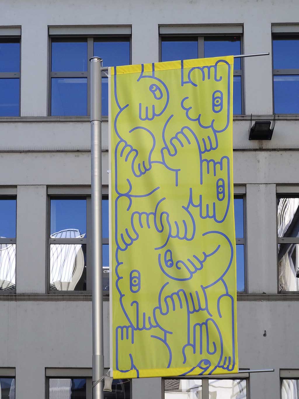 Flaggendesign von Verena Mack als Zeichen von Anteilnahme und Solidarität mit der Ukraine anlässliches des russischen Angriffskrieges bei der HfG in Offenbach.