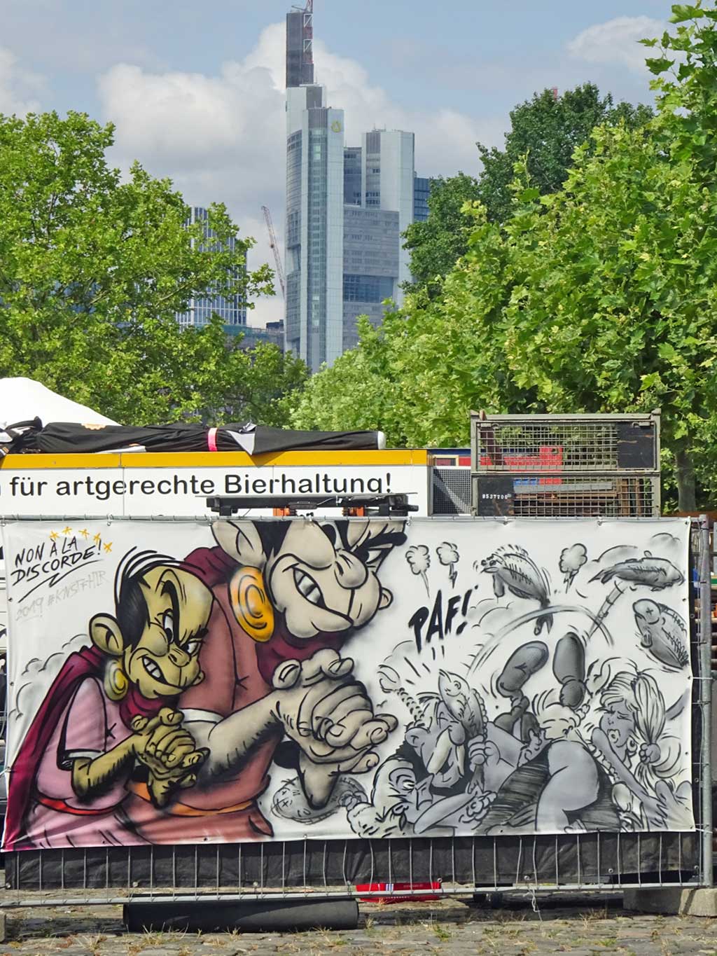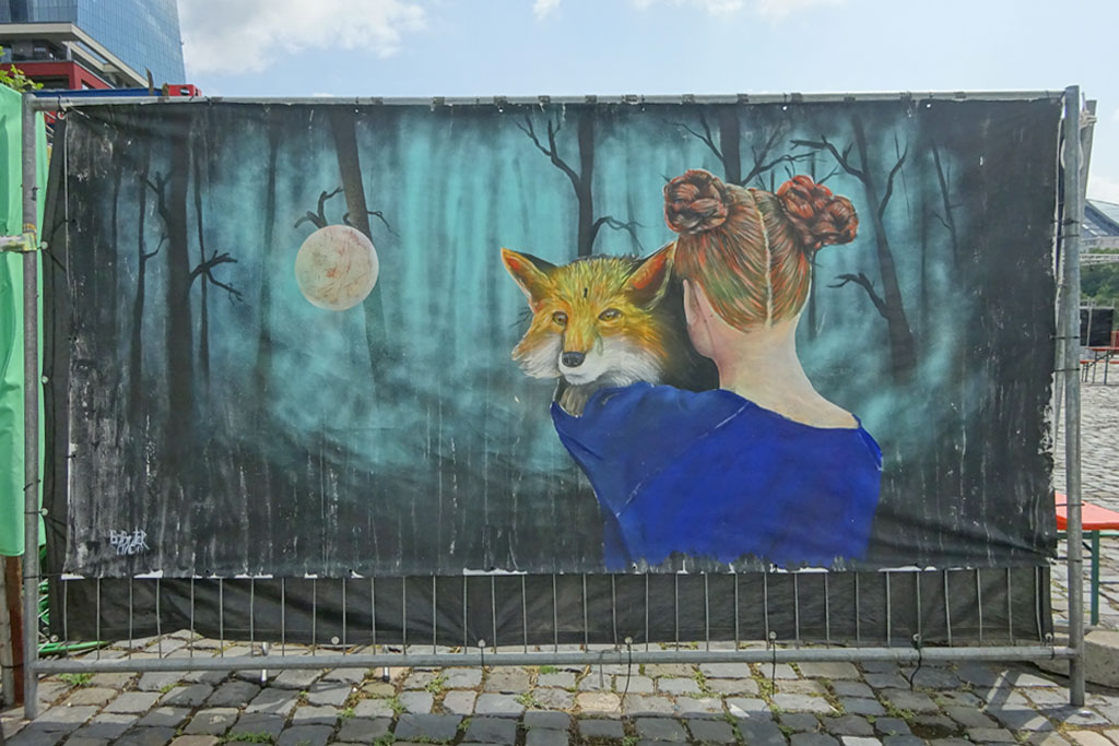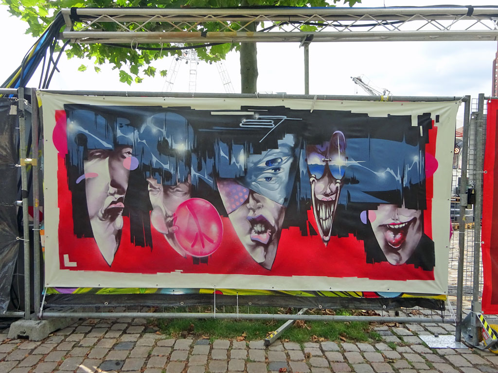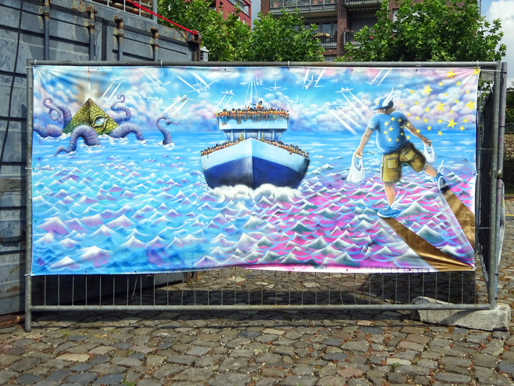 Graffitiartists haben die Sichtschutzplanen auf dem Veranstaltungsgelände an der Weseler Werf in Frankfurt künstlerisch neu gestaltet. Neben einigen Motiven aus dem Vorjahr, sind diesmal vor allem neue Bilder von Indian, aber auch von Boboter One, Knstfhlr, Obskur, Uzo u.a. zu sehen. Letzter Tag der Sommerwerft ist übrigens schon am Sonntag, 4. August 2019.