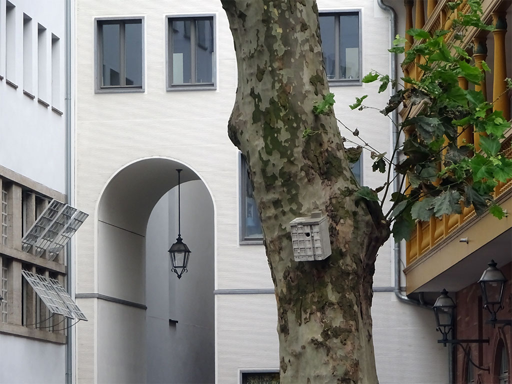 Nicht neu, aber neu entdeckt: Der „Sozialmeisenbau“ des Künstlers Guido Zimmermann. Nachdem er bereits zuvor mit seinen Cuckoo Blocks genannten Wohnhochhaus-Kuckucksuhren international für Beachtung gesorgt hatte, weitete er das Themengebiet auf Behausungen für Vögel aus. An einem Baum in der Frankfurter Altstadt hängt bereits seit einiger Zeit ein solcher wetterfester Nistkasten für Meisen.