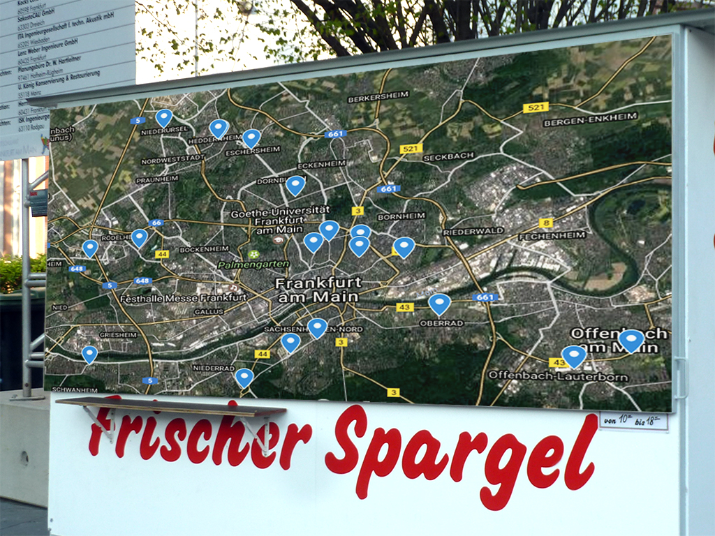 Übersichtskarte von Standorten mit Spargelständen in Frankfurt und Offenbach