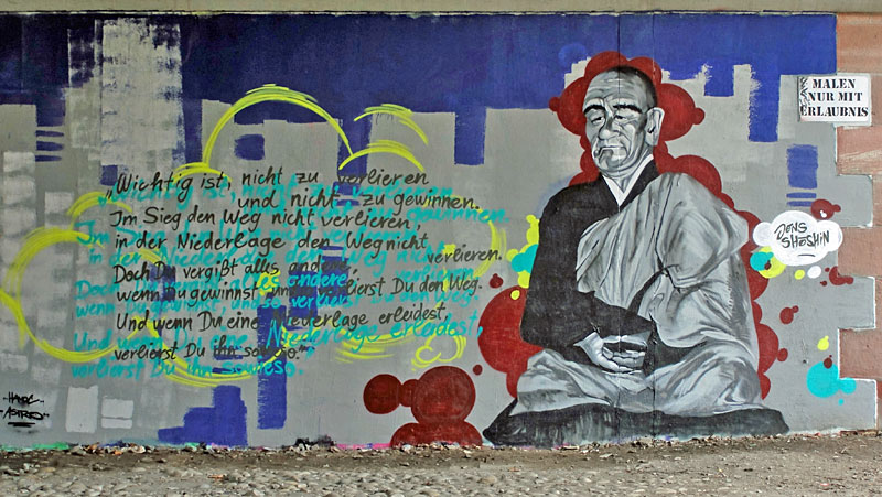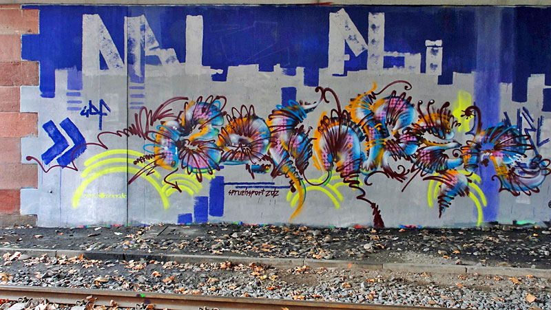 Neues von der Freiluftgalerie an der Friedensbrücke in Frankfurt: Zu sehen sind Graffiti von Bomber, Toe One und Jens Shoshin.