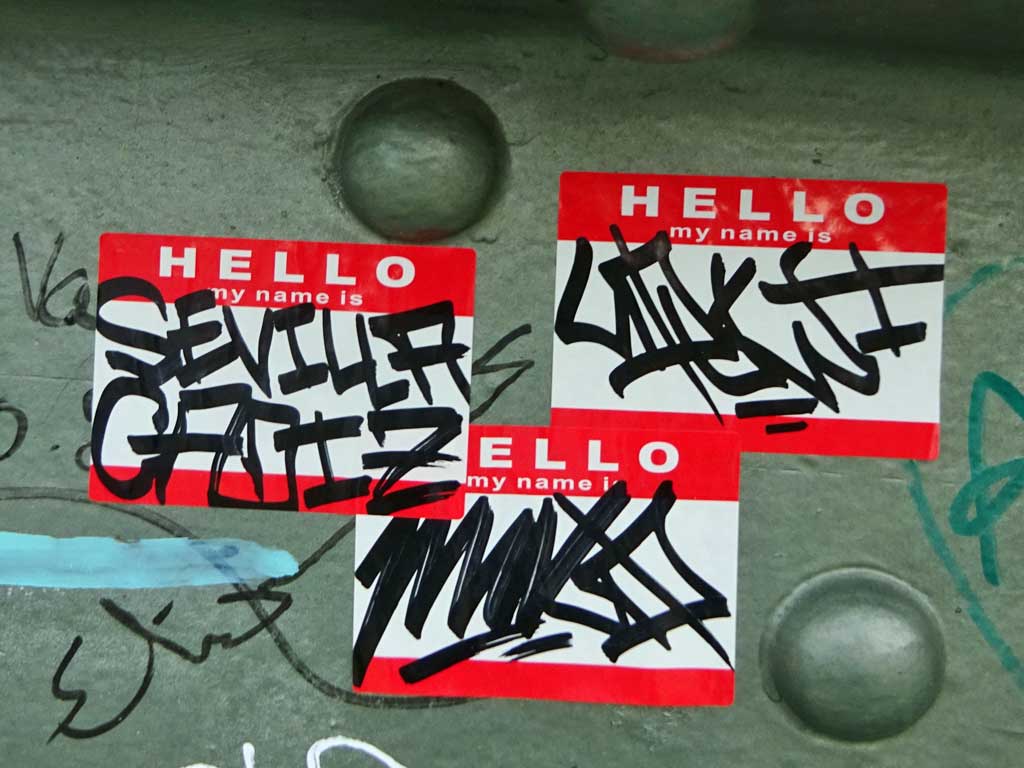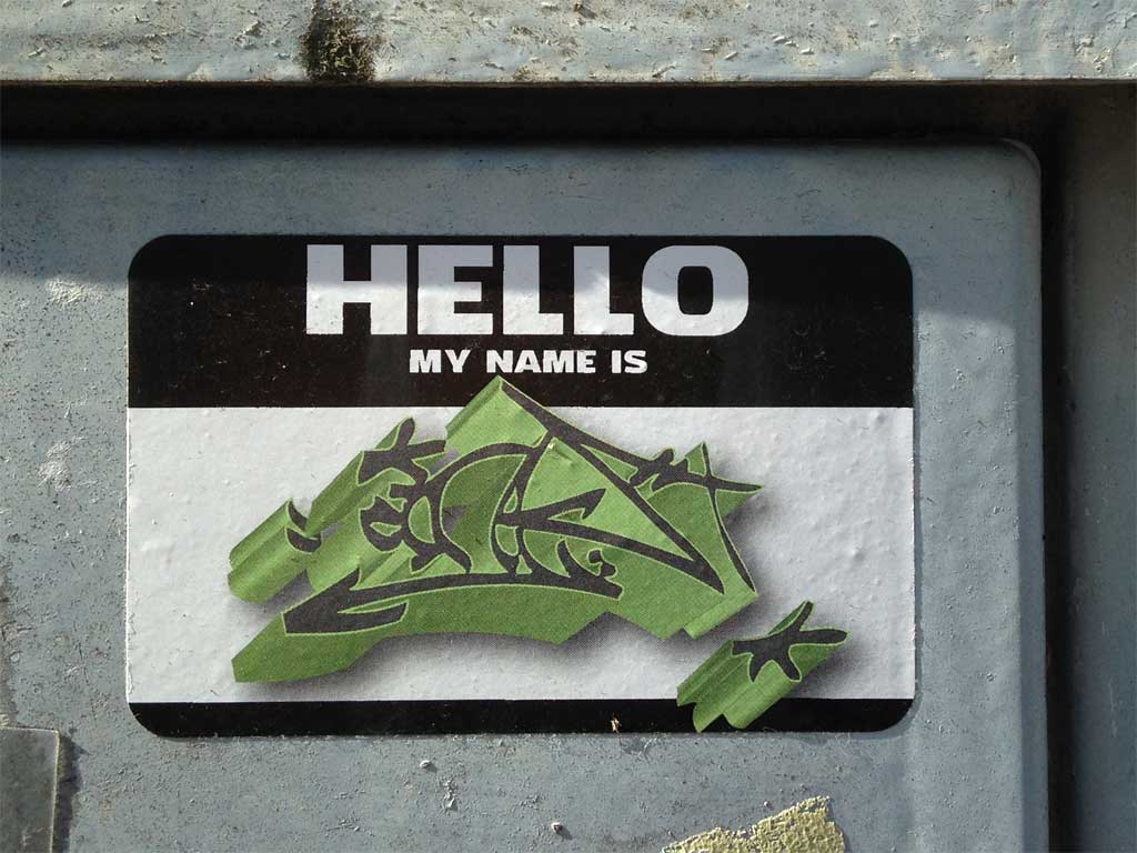 Neben den Versandaufklebern, die in Postfilialen kostenlos erhältlich sind und (mal mehr und mal weniger) künstlerisch umgestaltet ihren Weg in den öffentlichen Raum finden, sind die HELLO MY NAME IS-Sticker auch eine Konstante in Sachen Sticker-Art. Bei diesen wird jedoch eher selten die gesamte Fläche des Aufklebers übermalt, sondern das dafür vorgesehene Feld genutzt, um einen Namen oder anderen Text zu draufzuschreiben. Preislich liegt so etwas bei 5 bis 10 Euro für 100 bis 250 Stück.